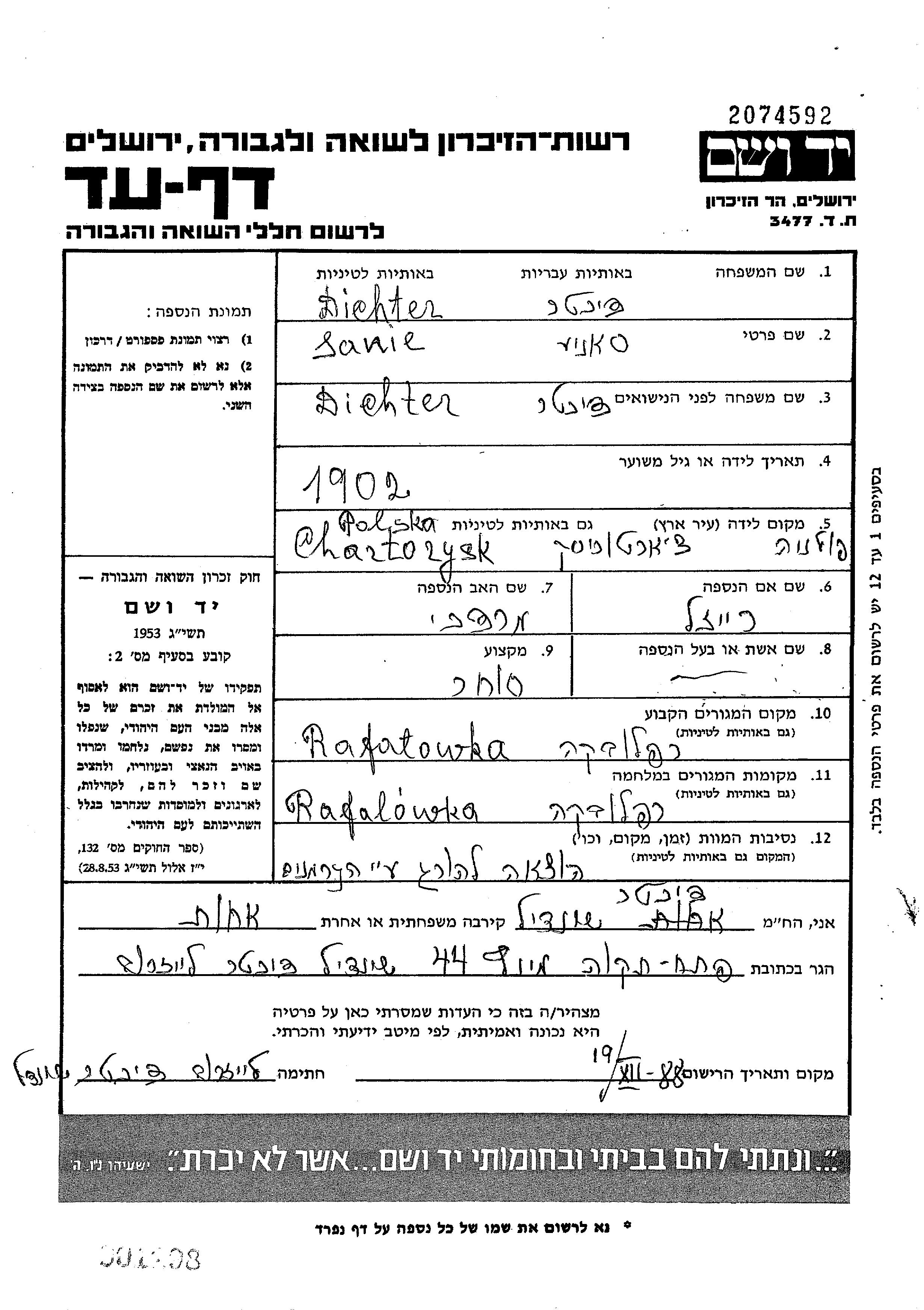 Sanie Dichter wurde im Jahr 1902 in Czartorysk, Polen geboren. Er war der Sohn von Mordchaj und Rejzel, geb. Bakalchuk. Er war Kaufmann/-frau und mit Chenia Henia Verheiratet. Vor dem Zweiten Weltkrieg lebte er in Rafałówka, Polen. Während des Krieges war er in Rafałówka, Polen.
