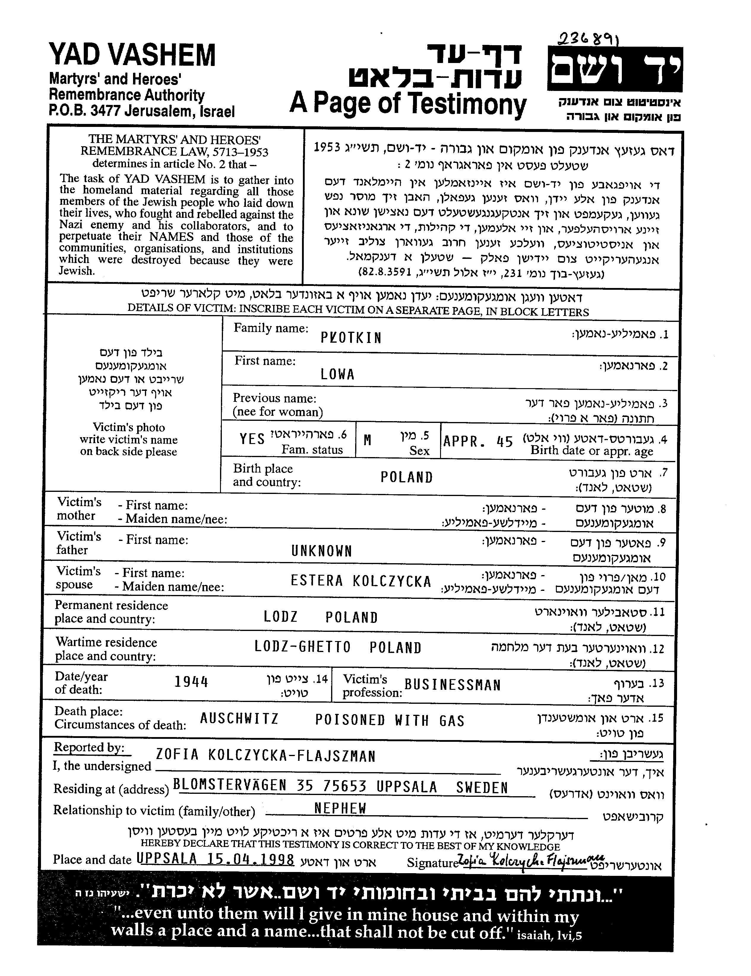 Lowa Plotkin wurde im Jahr 1899 in Polen geboren. Er war Geschäftsmann und mit Estera Verheiratet. Vor dem Zweiten Weltkrieg lebte er in Lodz, Polen. Während des Krieges war er in Lodz, Polen.