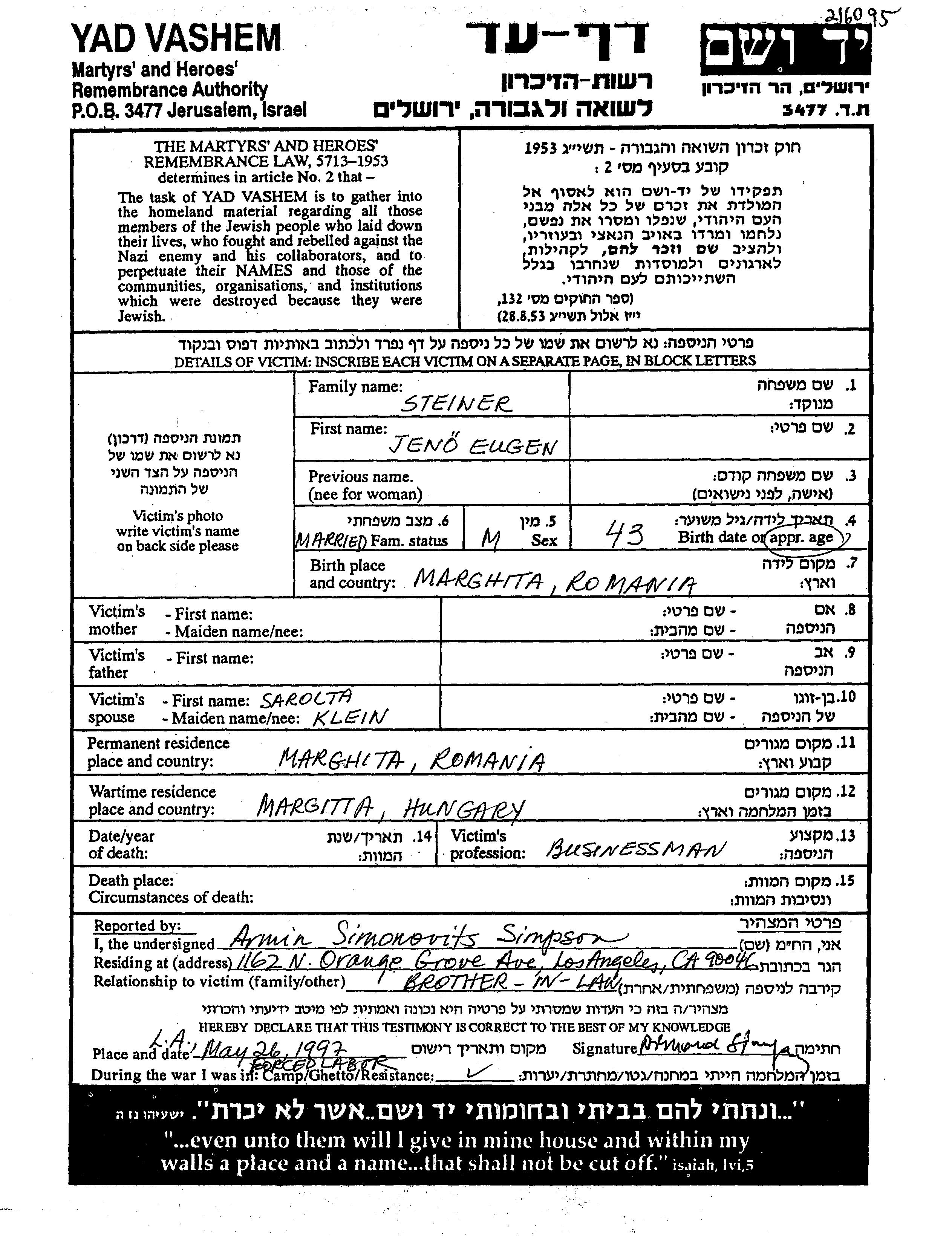 Jeno Eugen Steiner wurde in Marghita, Rumänien geboren. Er war Kaufmann/-frau und mit Sarolta Sara Verheiratet. Vor dem Zweiten Weltkrieg lebte er in Marghita, Rumänien. Während des Krieges war er in Marghita, Rumänien.