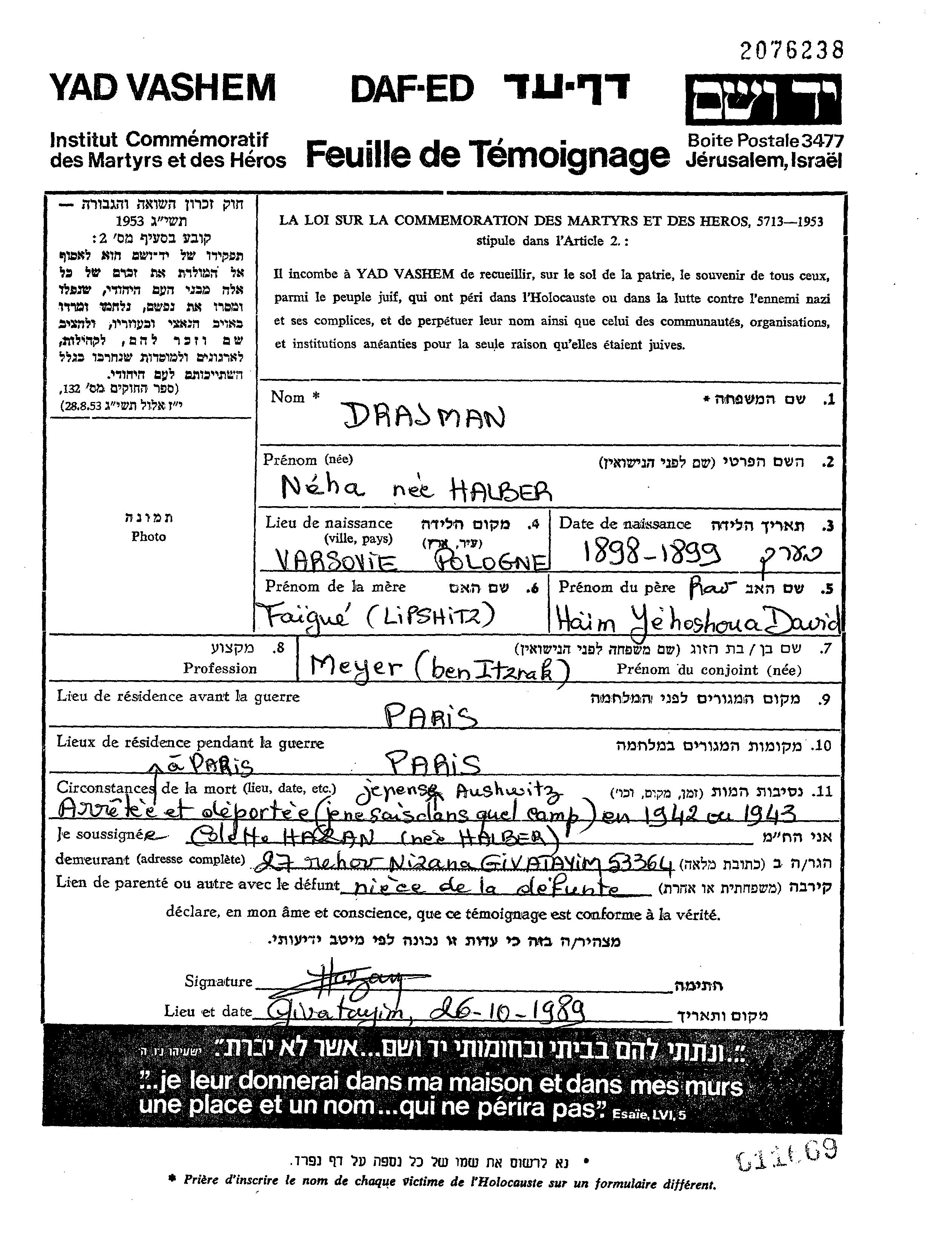 Neha Drajman, geb. Halber wurde im Jahr 1898 in Warszawa, Polen geboren. Sie war die Tochter von Haim Jehoshoua David und Faigue, geb. Lifshitz. Sie war mit Meyer Verheiratet. Vor dem Zweiten Weltkrieg lebte sie in Paris, Frankreich. Während des Krieges war sie in Paris, Frankreich.