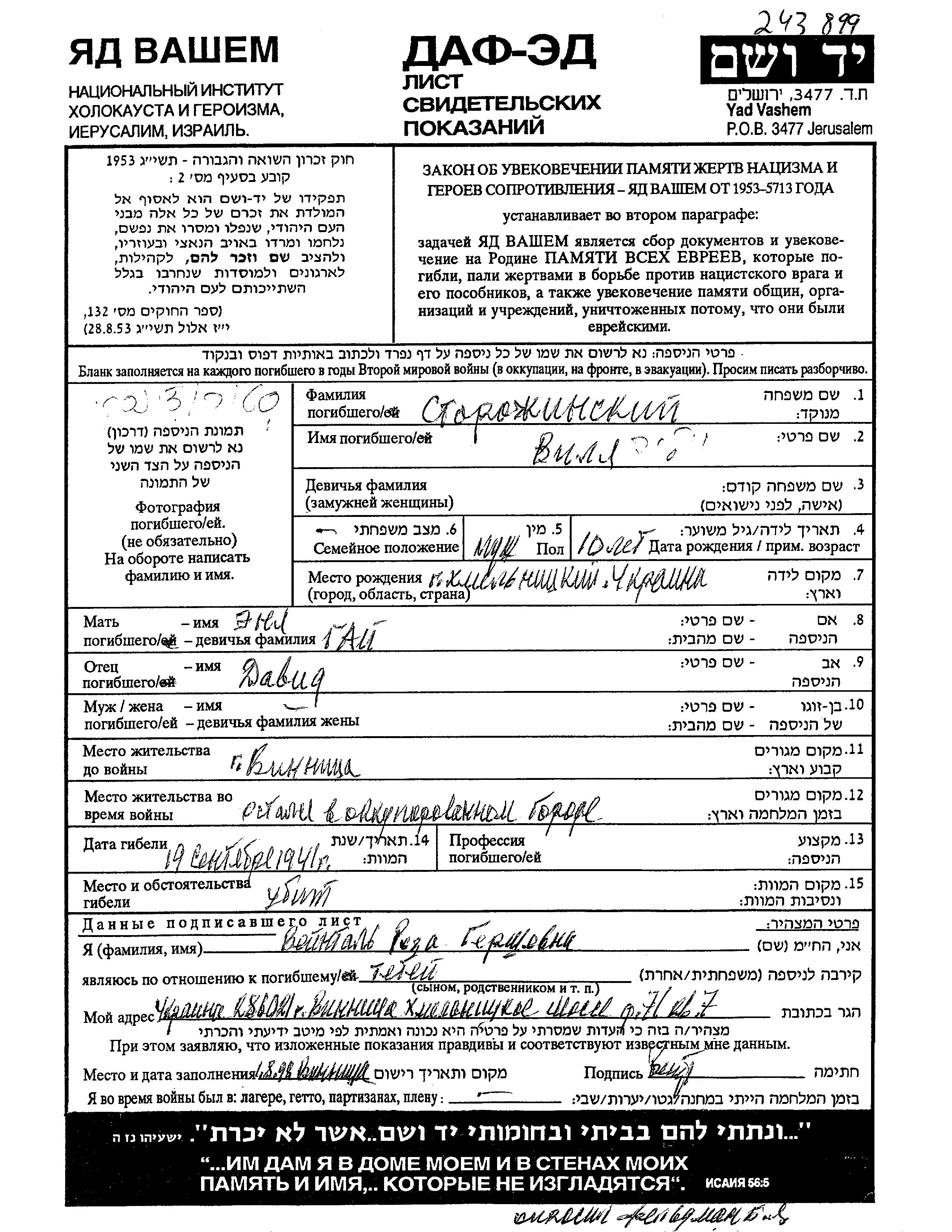 Vilya Storozhinski wurde im Jahr 1931 in Proskurov, Ukraine (UdSSR) geboren. Er war der Sohn von David und Enya, geb. Gay. Er war Kind. Vor dem Zweiten Weltkrieg lebte er in Vinnitsa, Ukraine (UdSSR). Während des Krieges war er in Vinnitsa, Ukraine (UdSSR).