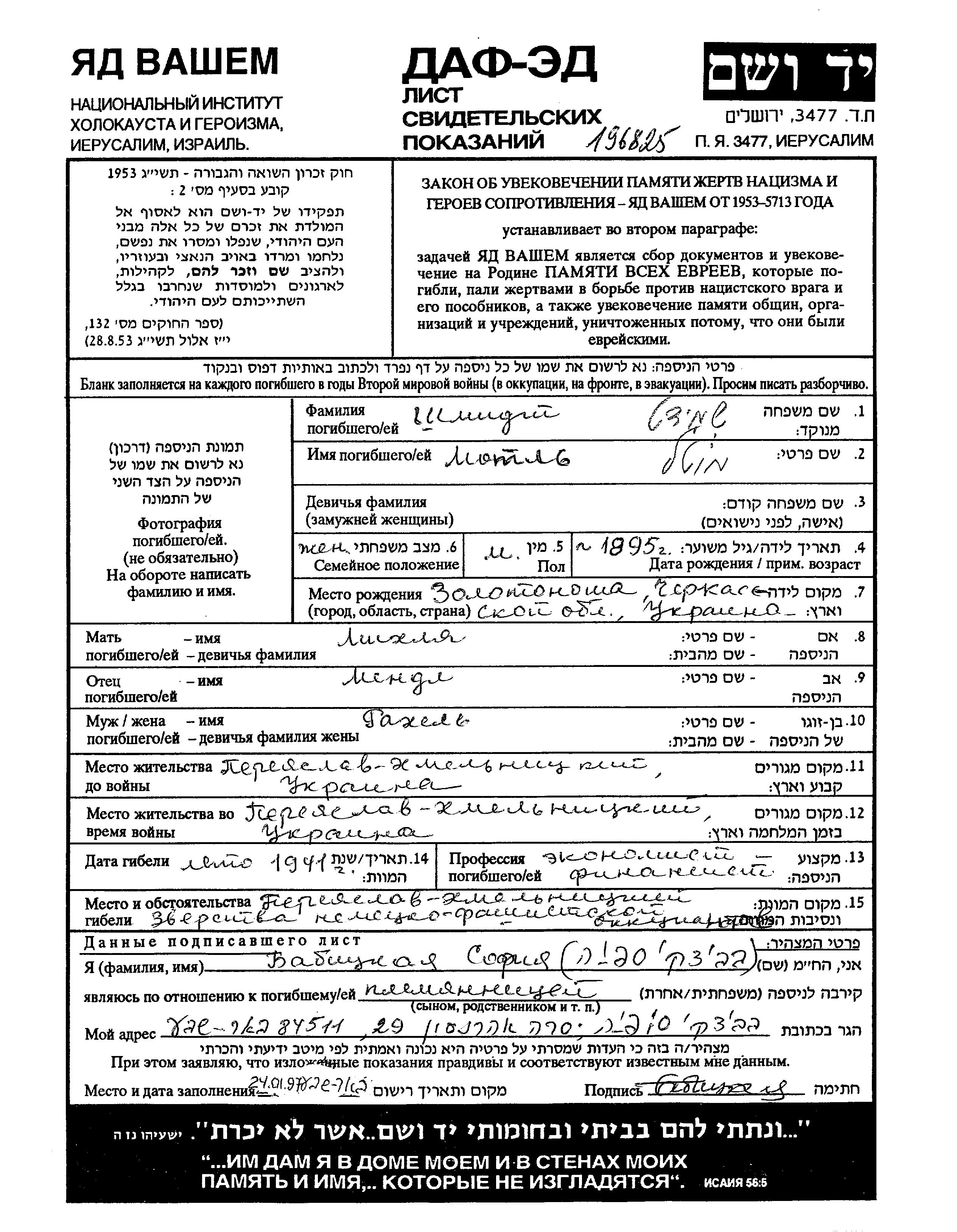 Motl Motel Shmidt wurde im Jahr 1895 in Zolotonosha, Ukraine (UdSSR) geboren. Er war der Sohn von Mendl und Mikhlya. Er war Ökonom/-in und mit Rakhel Verheiratet. Vor dem Zweiten Weltkrieg lebte er in Pereyaslav Khmelnitskiy, Ukraine (UdSSR). Während des Krieges war er in Pereyaslav Khmelnitskiy, Ukraine (UdSSR).