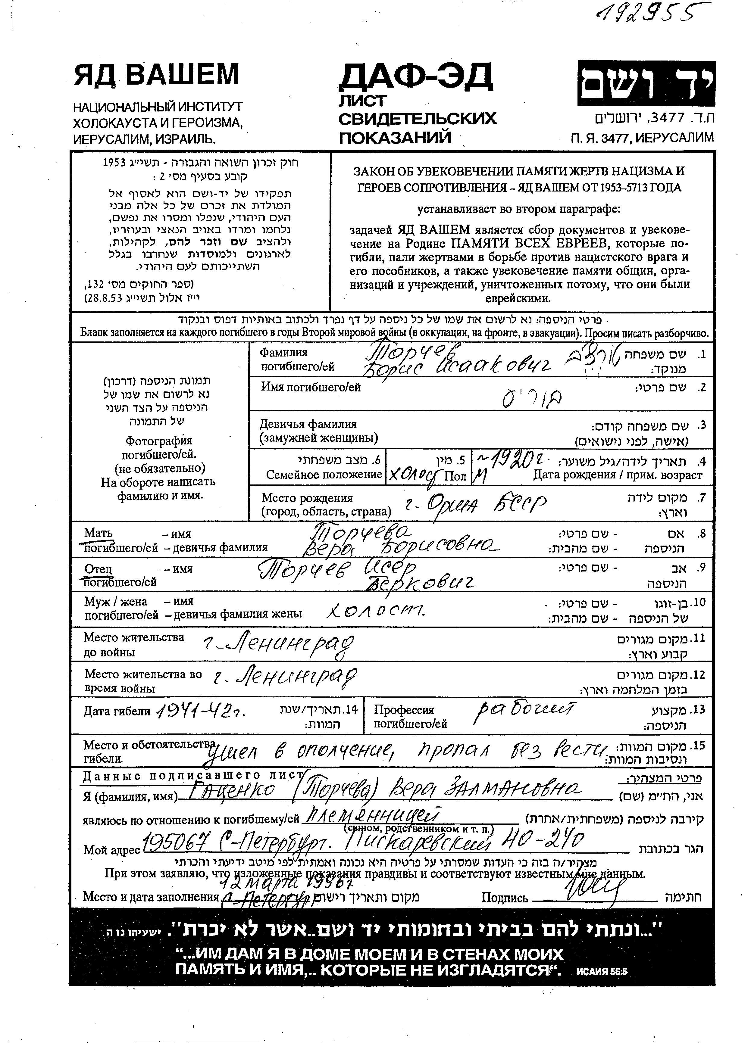 Boris Torchev wurde im Jahr 1920 in Orsha, Weißrussland (UdSSR) geboren. Er war der Sohn von Isser und Vera. Er war Arbeiter/-in und Ledig. Vor dem Zweiten Weltkrieg lebte er in Leningrad, Russland (UdSSR). Während des Krieges war er in die Sowjetischen Streitkräfte.