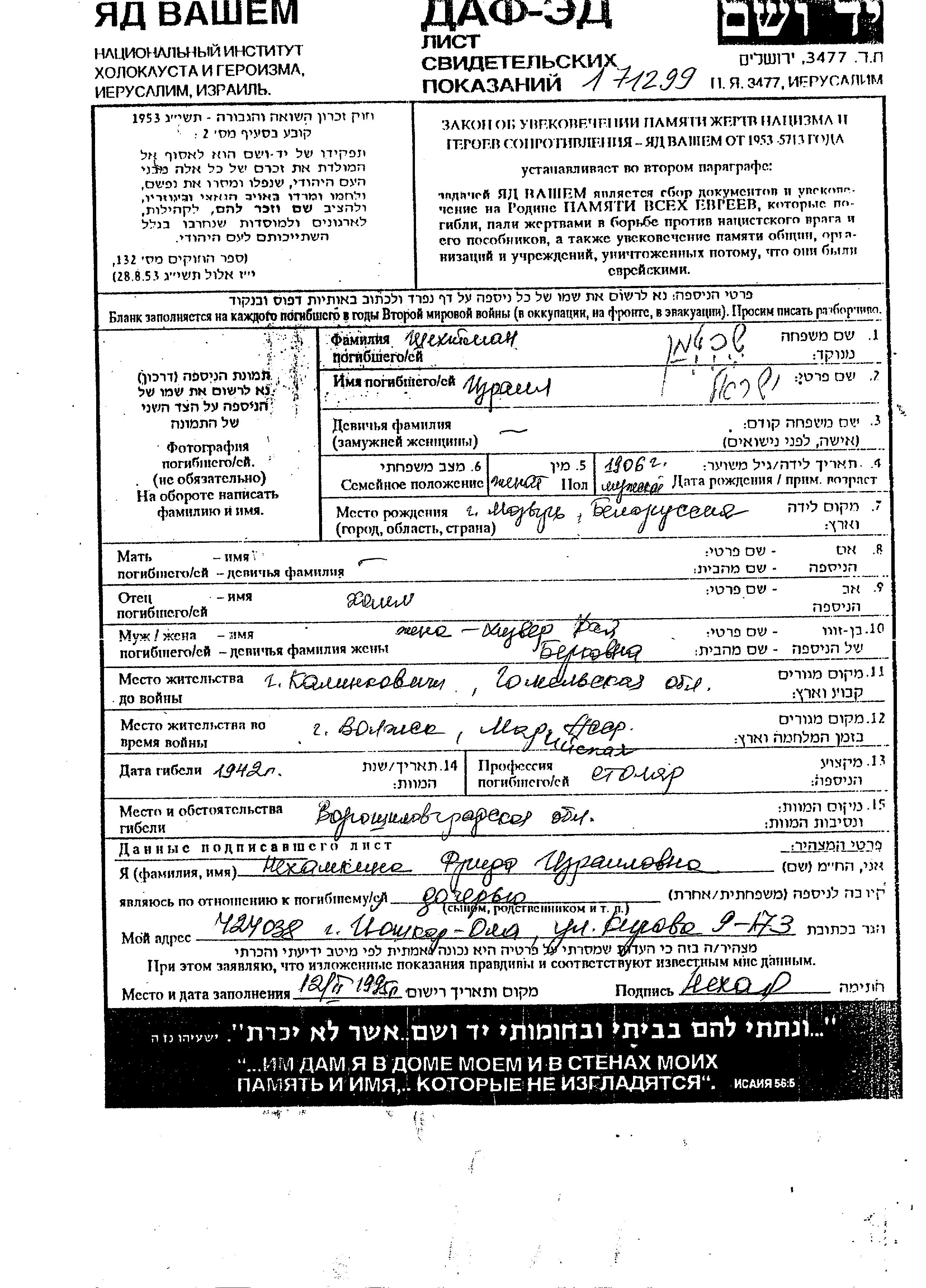 Izrail wurde in der Schoah ermordet. Todesort: Voroshilovgrad, Ukraine (UdSSR) im Jahr 1942.