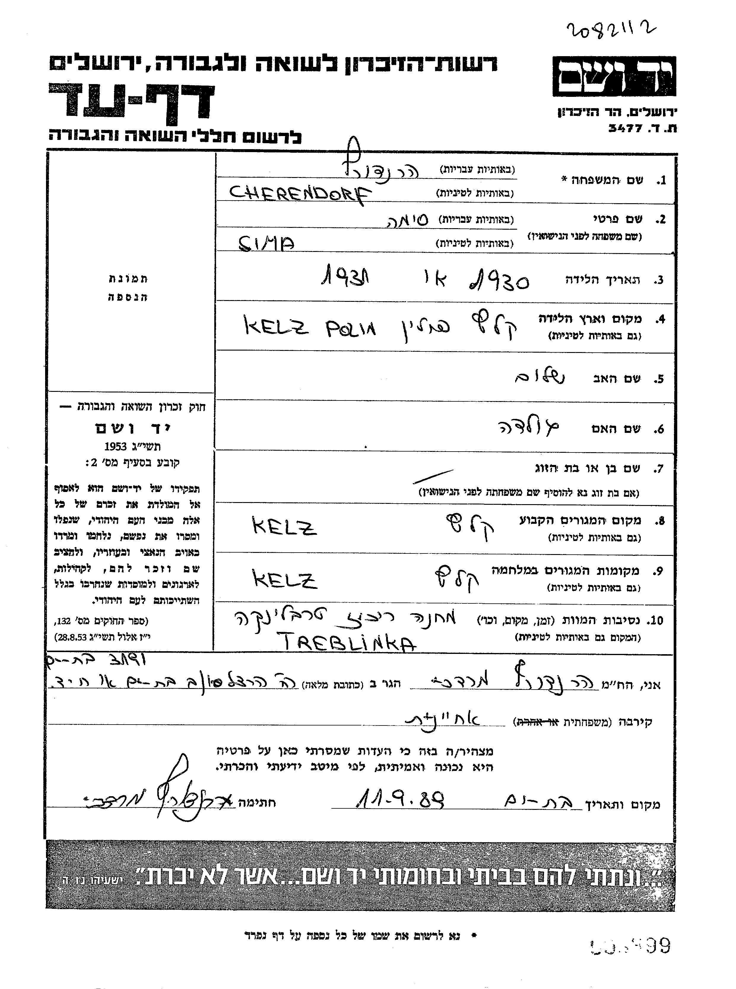 Sima Cherendorf wurde in Kielce, Polen geboren. Sie war die Tochter von Shalom und Golda. Sie war Kind. Vor dem Zweiten Weltkrieg lebte sie in Kielce, Polen. Während des Krieges war sie in Kielce, Polen.