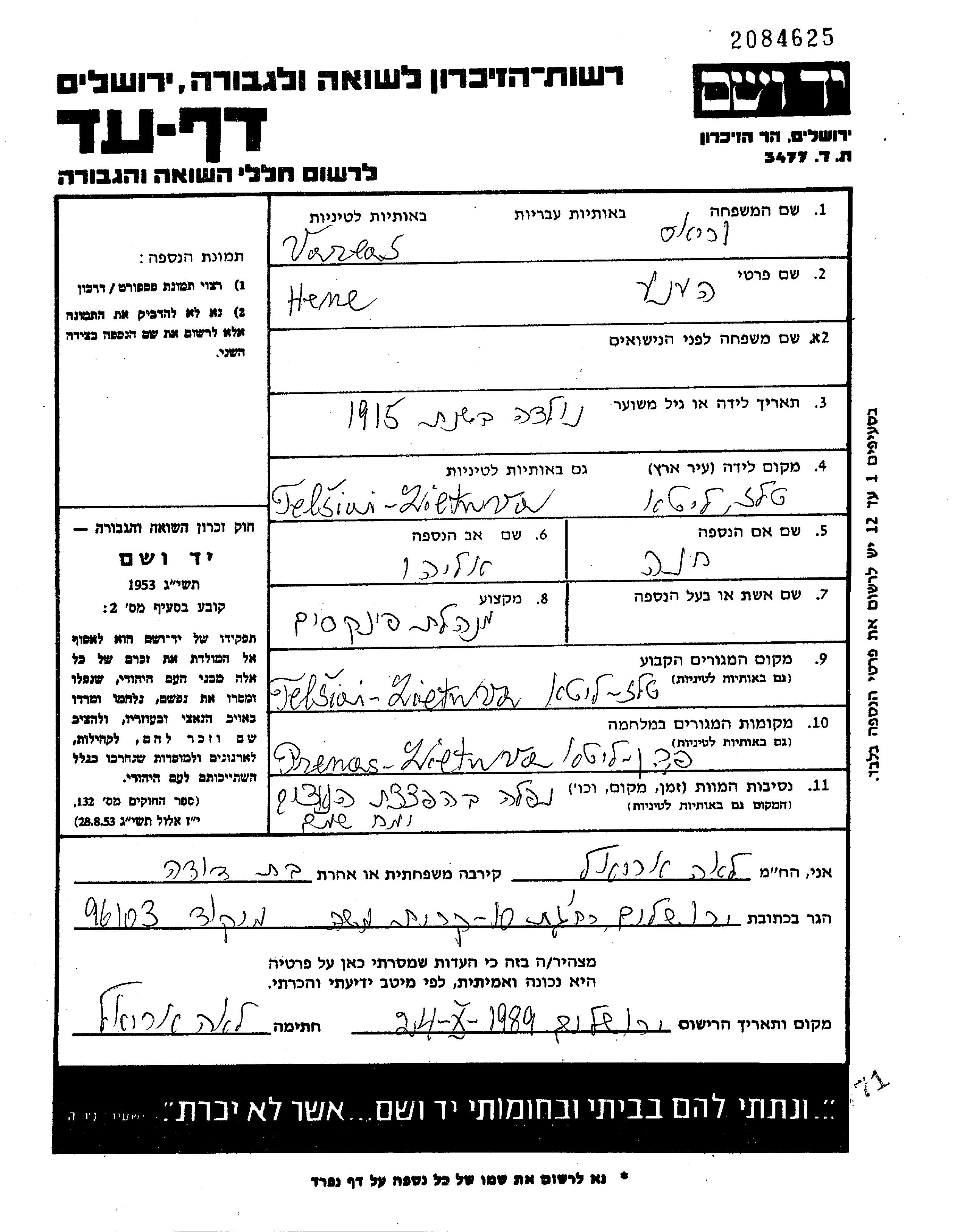Hene Vareas wurde im Jahr 1915 in Telsiai, Litauen geboren. Sie war die Tochter von Elijahu und Chana, geb. Akerman. Sie war Buchhalter/-in. Vor dem Zweiten Weltkrieg lebte sie in Telsiai, Litauen. Während des Krieges war sie in Pren, Litauen.
