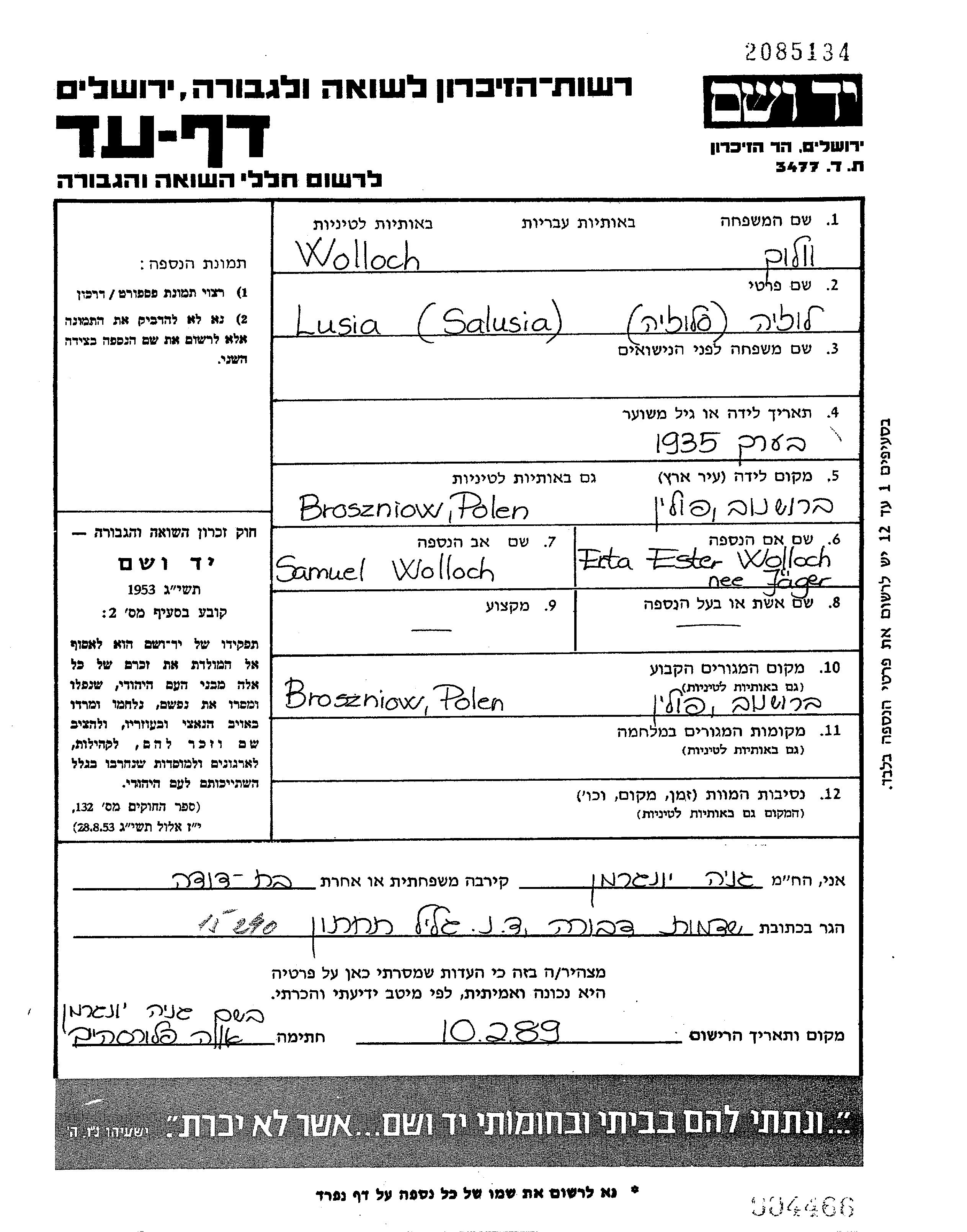Lusia Salusia Luzia Wolloch wurde im Jahr 1935 in Broszniow, Polen geboren. Sie war die Tochter von Shmuel und Erta Ester, geb. Jäger. Sie war Kind. Vor dem Zweiten Weltkrieg lebte sie in Broszniow, Polen. Während des Krieges war sie in Broszniow, Polen.
