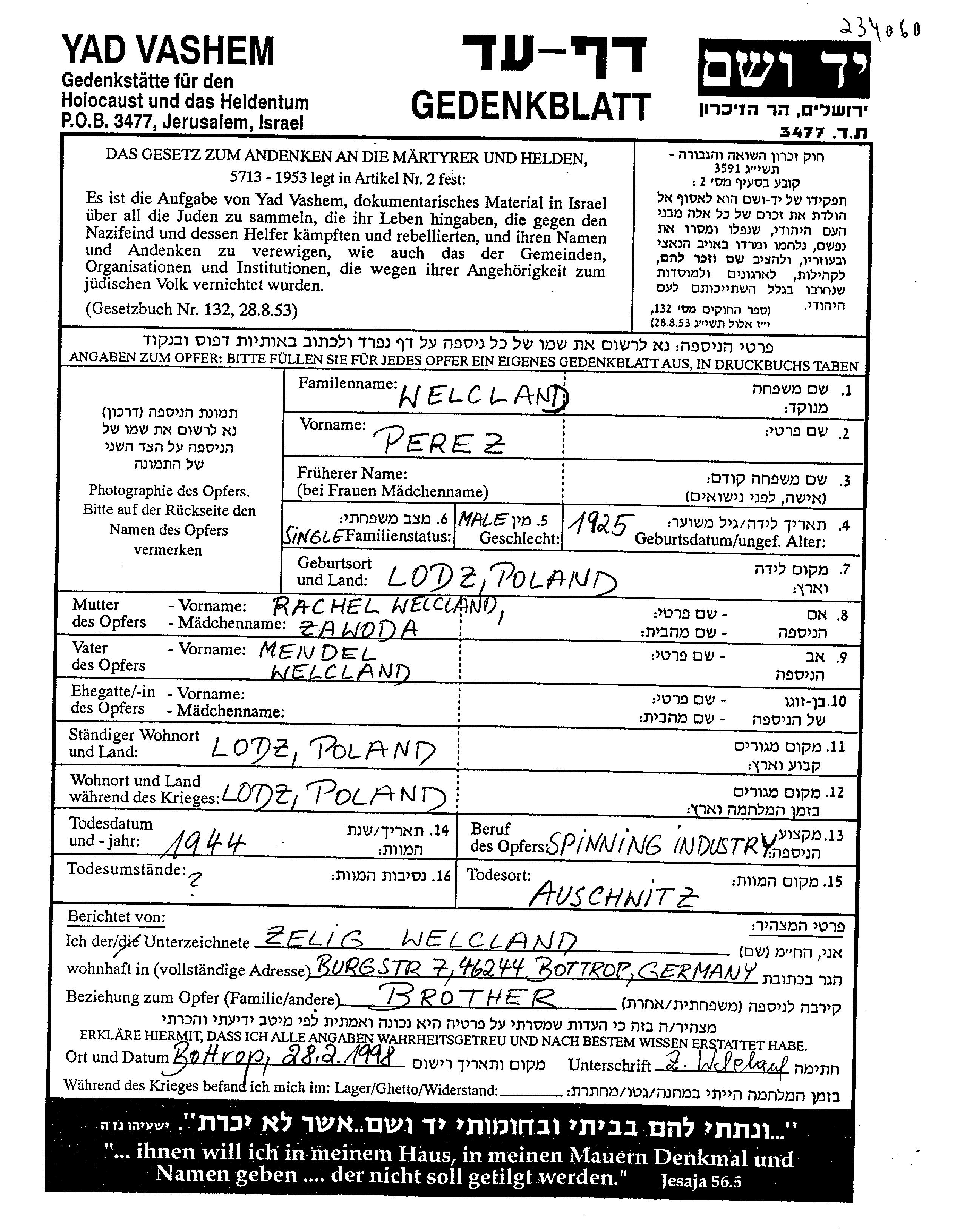 Perez Welcland wurde im Jahr 1925 in Lodz, Polen geboren. Er war der Sohn von Mendel und Rachel, geb. Zawoda. Er war Arbeiter/-in und Ledig. Vor dem Zweiten Weltkrieg lebte er in Lodz, Polen. Während des Krieges war er in Lodz, Polen.