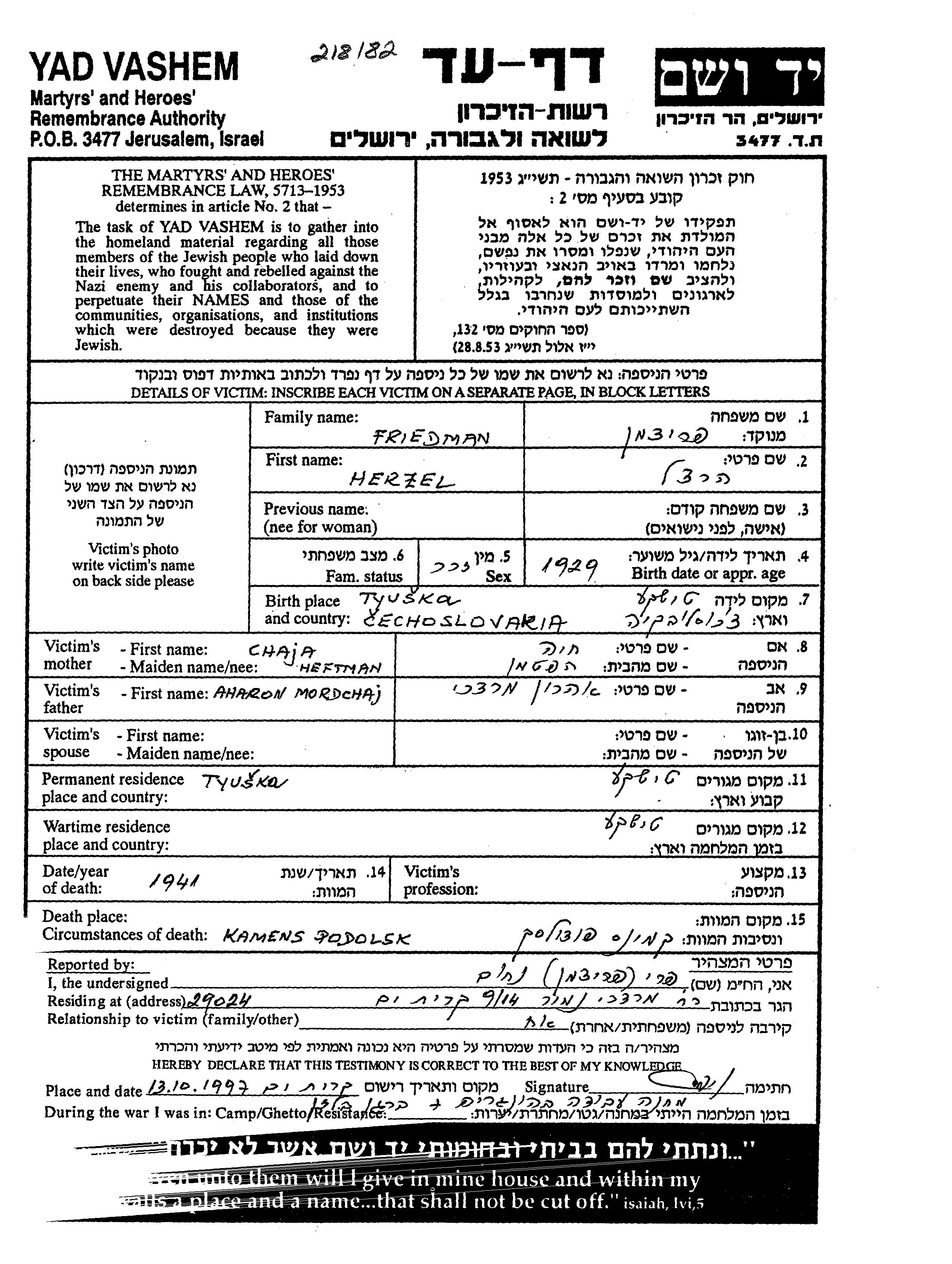 Herzel wurde in der Schoah ermordet. Todesort: Kamenets Podolsk, Ukraine (UdSSR) im Jahr 1941.