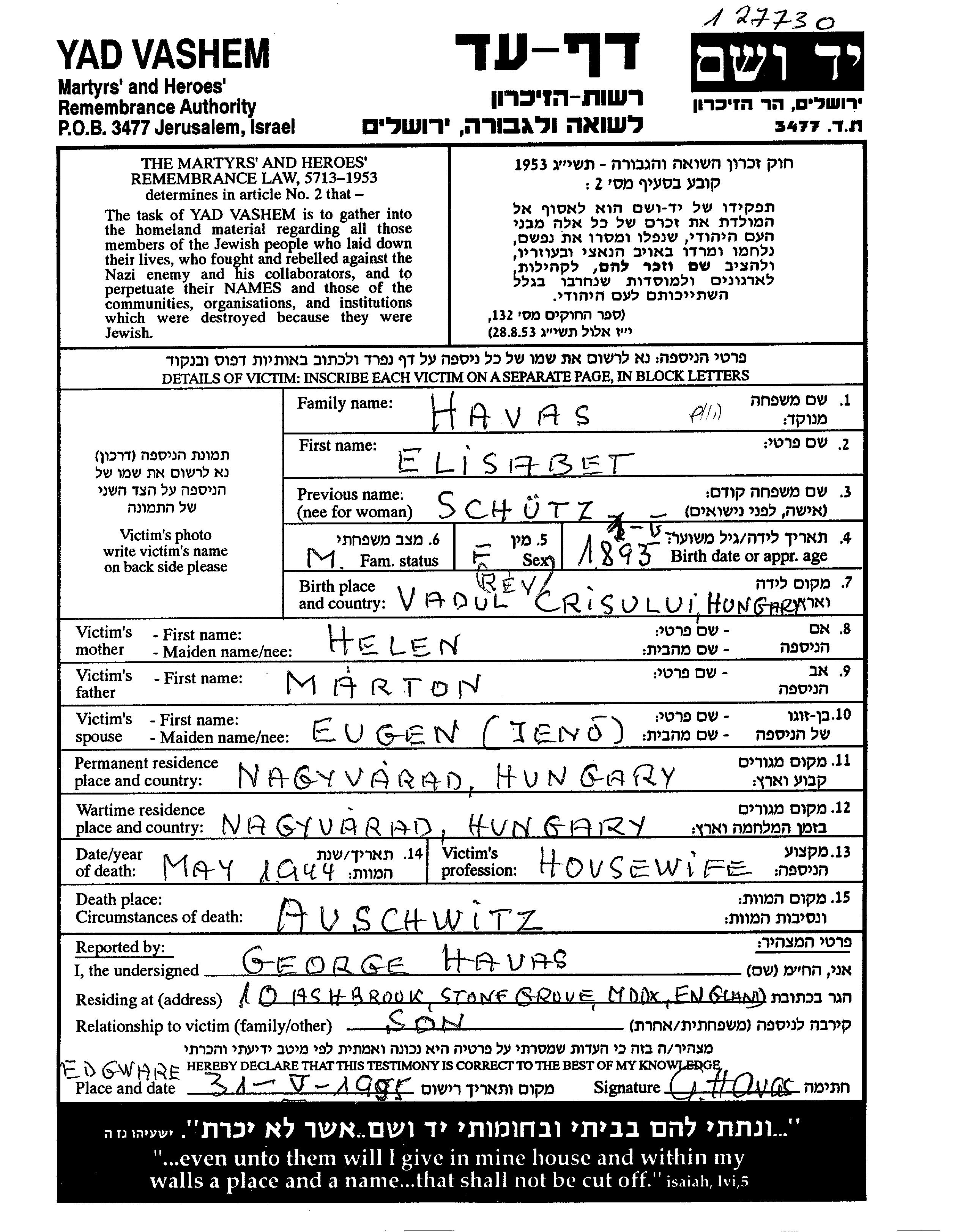 Elizabet Havas, geb. Schütz wurde im Jahr 1895 in Rev, Rumänien geboren. Sie war die Tochter von Marton und Helen, geb. Moskovits. Sie war Hausfrau und mit Jeno Eugen Verheiratet. Vor dem Zweiten Weltkrieg lebte sie in Nagyvarad, Rumänien. Während des Krieges war sie in Nagyvarad, Rumänien.