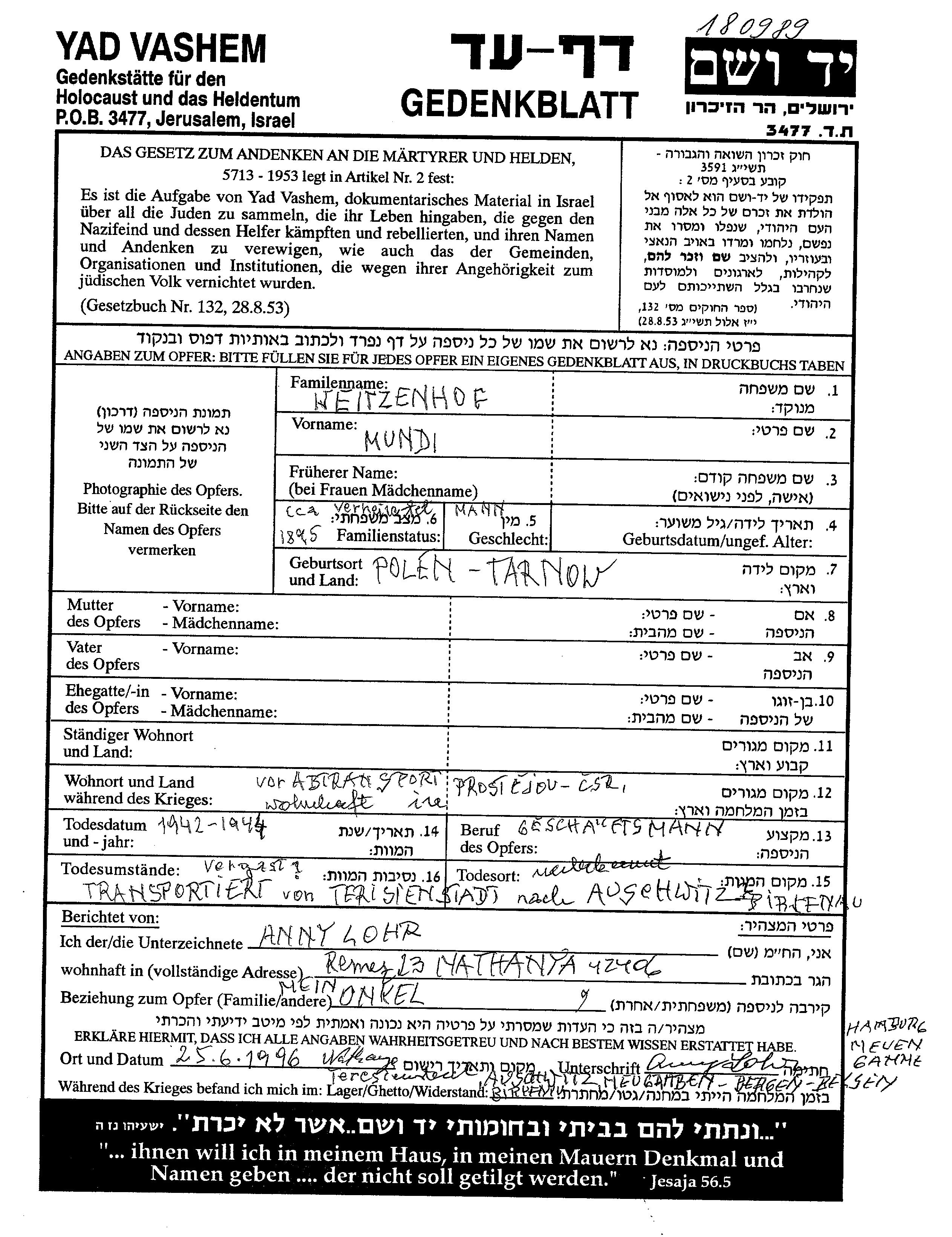 Mundi Weitzenhof wurde im Jahr 1895 in Tarnow, Polen geboren. Er war Geschäftsmann und mit Mizzi Mitzi Verheiratet. Vor dem Zweiten Weltkrieg lebte er in Prostejov, Tschechoslowakei. Während des Krieges war er in Tschechoslowakei.