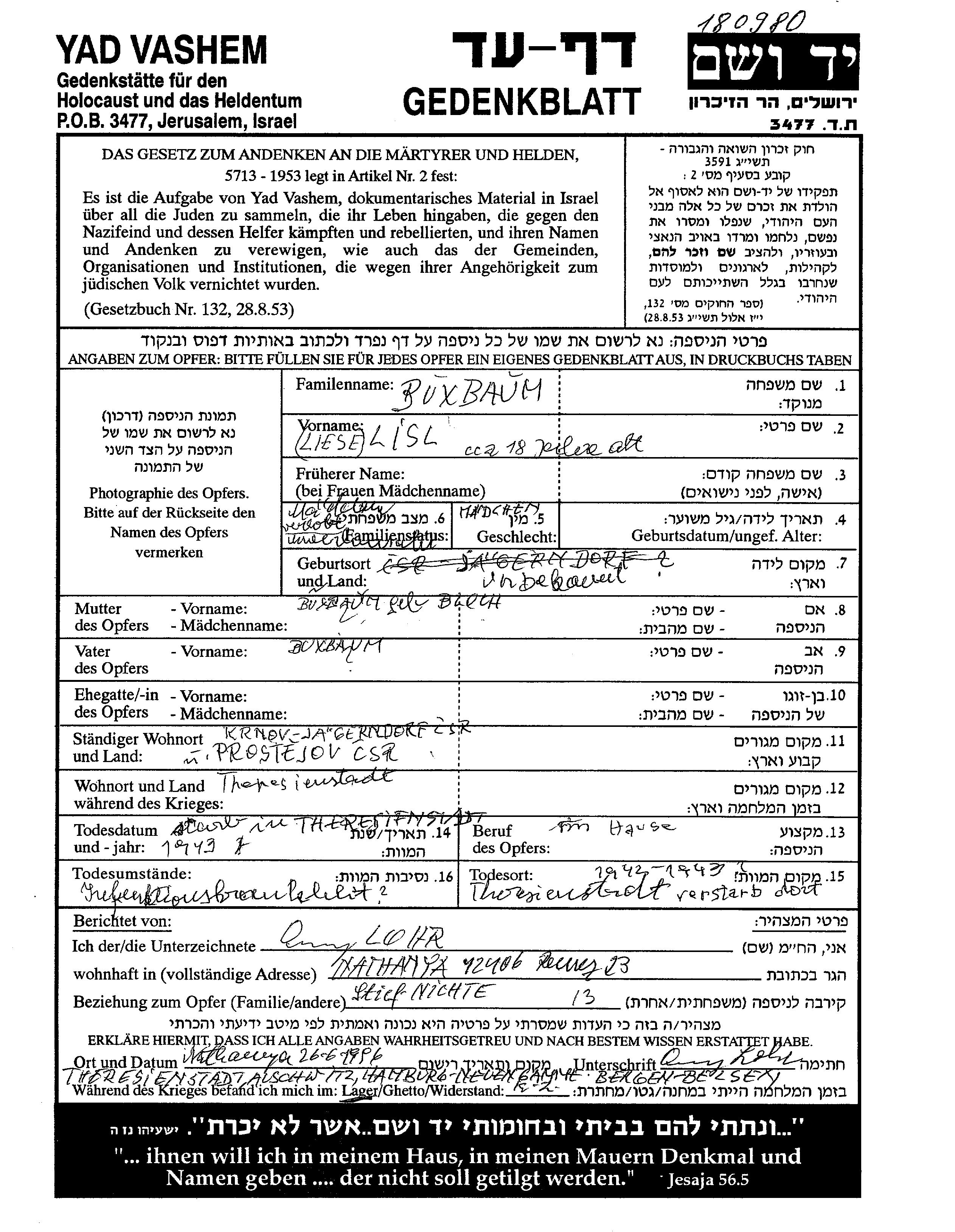 Liese Buxbaum wurde im Jahr 1925 geboren. Sie war Ledig. Vor dem Zweiten Weltkrieg lebte sie in Krnov, Tschechoslowakei. Während des Krieges war sie in Tschechoslowakei.