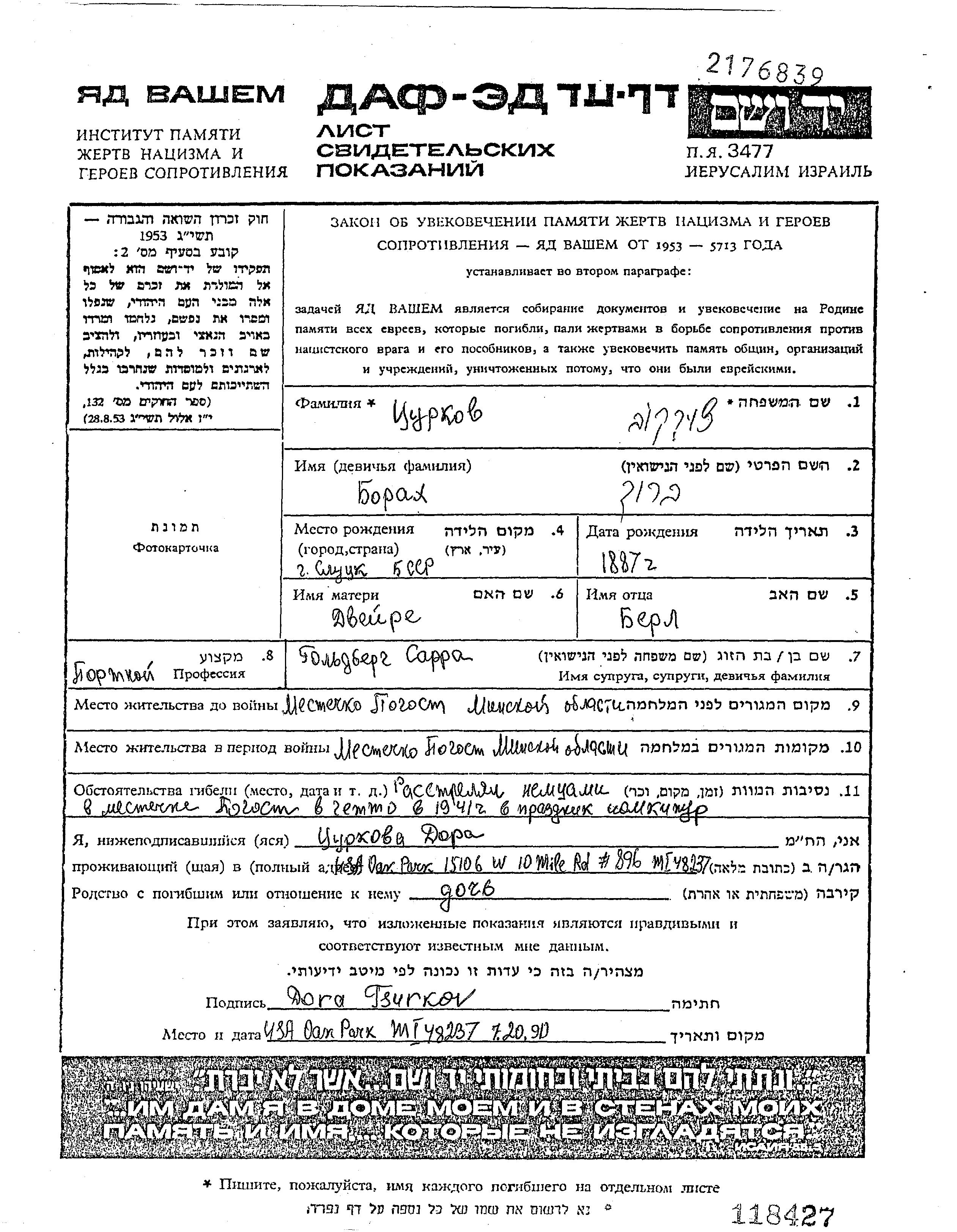 Borakh Churkov wurde im Jahr 1887 in Slutsk, Weißrussland (UdSSR) geboren. Er war der Sohn von Berl und Dveire. Er war Schneider und mit Sara, geb. Goldberg Verheiratet. Vor dem Zweiten Weltkrieg lebte er in Pogost (Town), Weißrussland (UdSSR). Während des Krieges war er in Pogost (Town), Weißrussland (UdSSR).