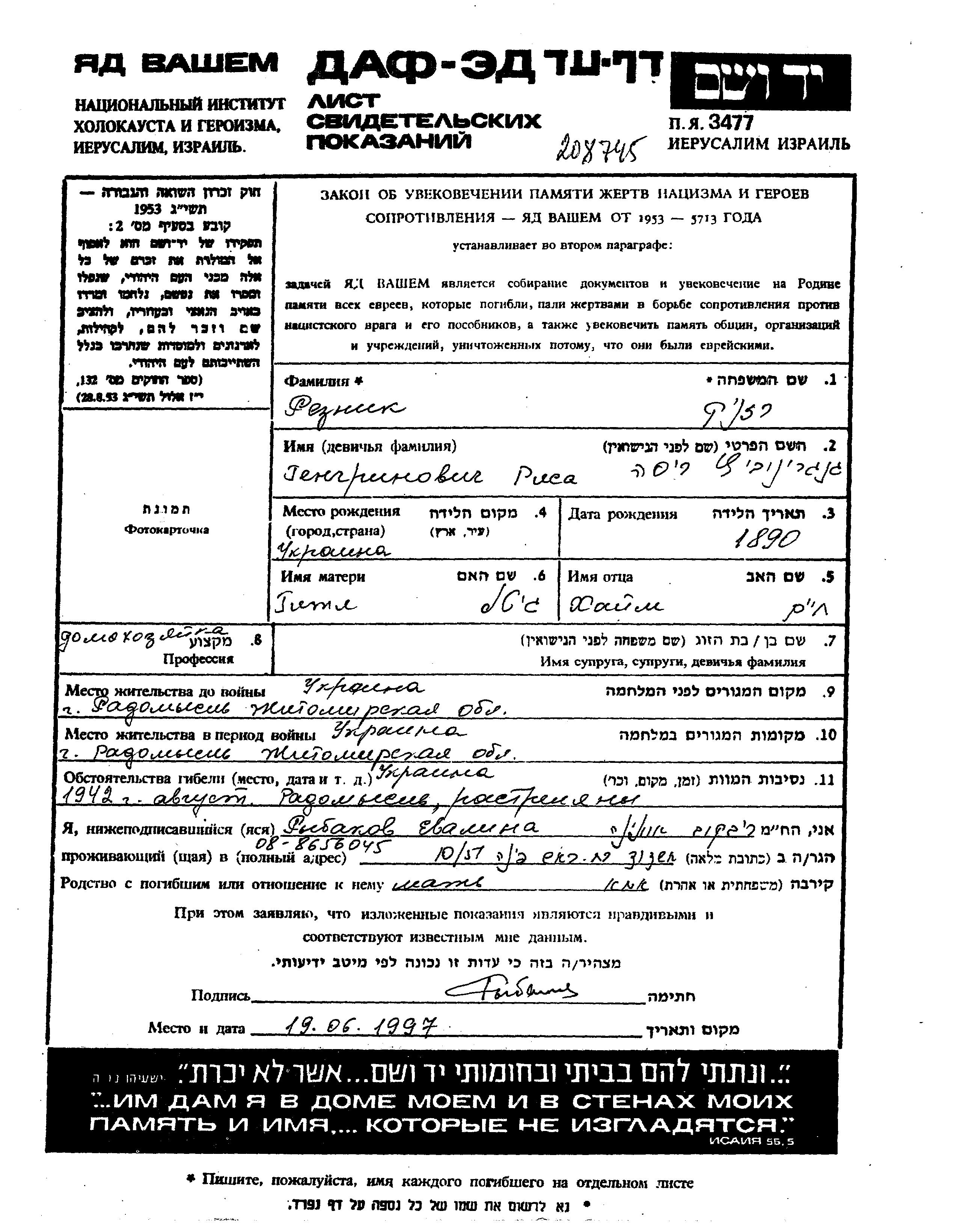 Risa Reznik, geb. Gengrinovich wurde im Jahr 1890 in Ukraine (UdSSR) geboren. Sie war die Tochter von Khaim und Gitl. Sie war Hausfrau und mit Abram Verheiratet. Vor dem Zweiten Weltkrieg lebte sie in Radomyshl, Ukraine (UdSSR). Während des Krieges war sie in Radomyshl, Ukraine (UdSSR).