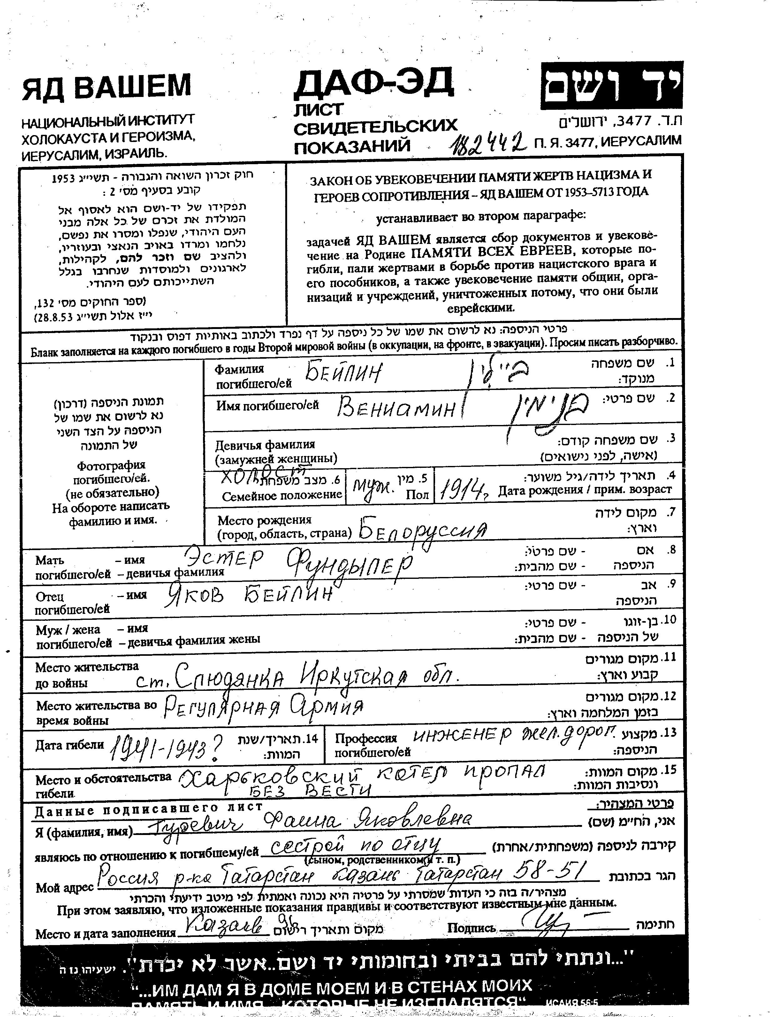 Veniamin Beilin wurde im Jahr 1914 in Weißrussland (UdSSR) geboren. Er war der Sohn von Yakov und Ester, geb. Fundyler. Er war Ingenieur und Ledig. Vor dem Zweiten Weltkrieg lebte er in Slyudyanka, Russland (UdSSR). Während des Krieges war er in die Sowjetischen Streitkräfte.