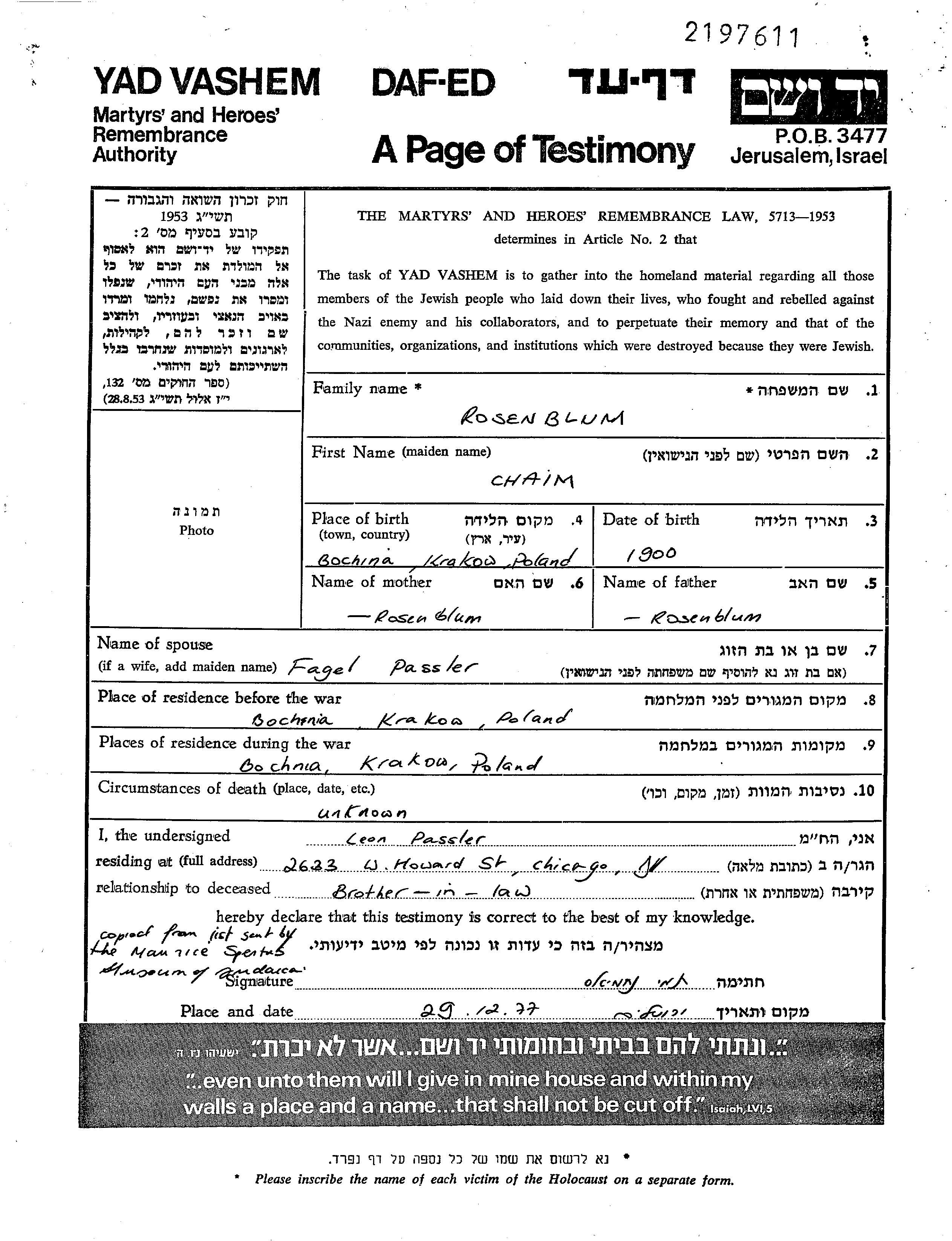 Chaim Rosenblum wurde im Jahr 1900 in Bochnia, Polen geboren. Er war mit Fagel, geb. Passler Verheiratet. Vor dem Zweiten Weltkrieg lebte er in Bochnia, Polen. Während des Krieges war er in Bochnia, Polen.