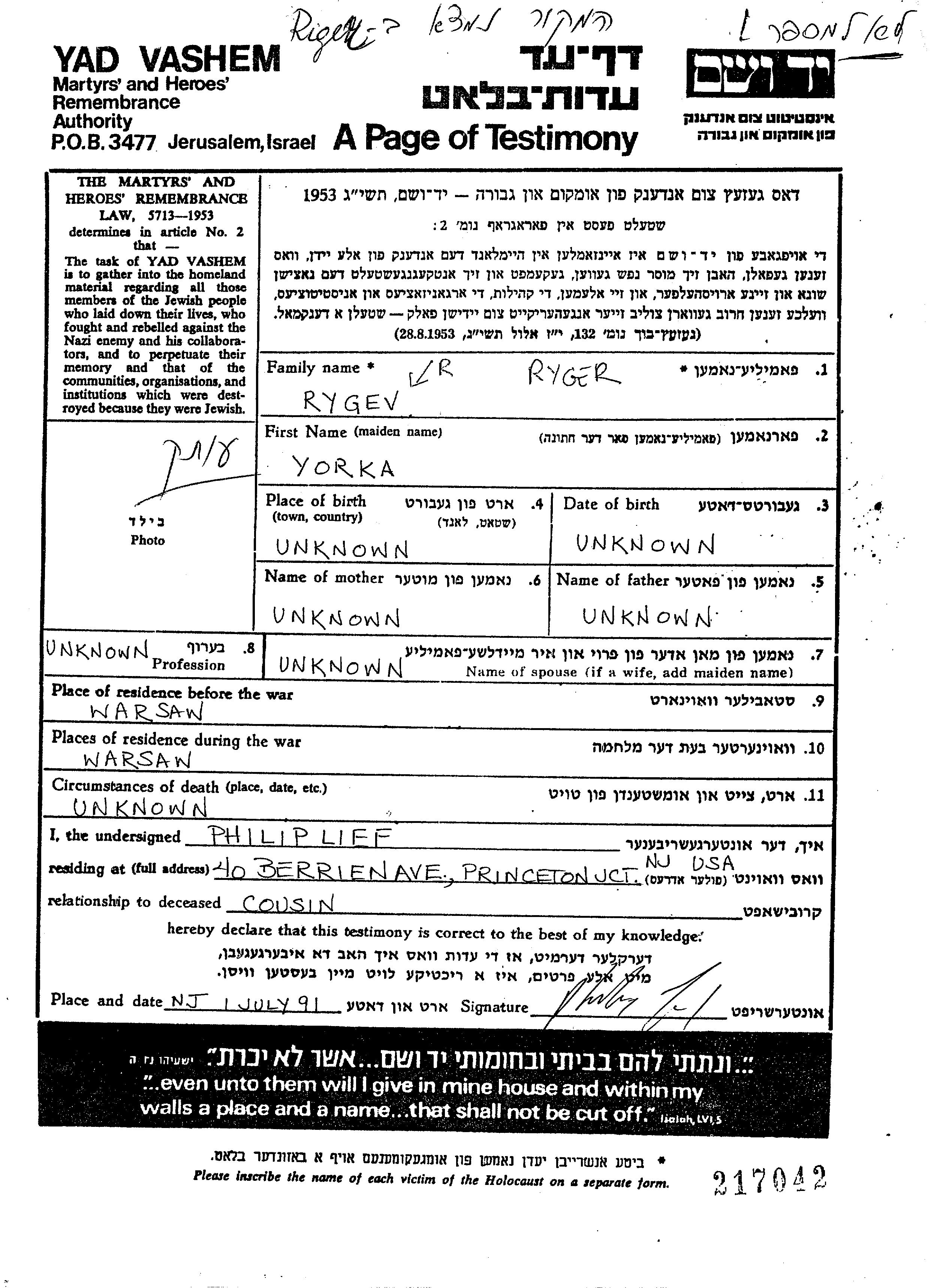 Yorka Ryger. Vor dem Zweiten Weltkrieg lebte sie in Warsaw, Polen. Während des Krieges war sie in Warsaw, Polen.