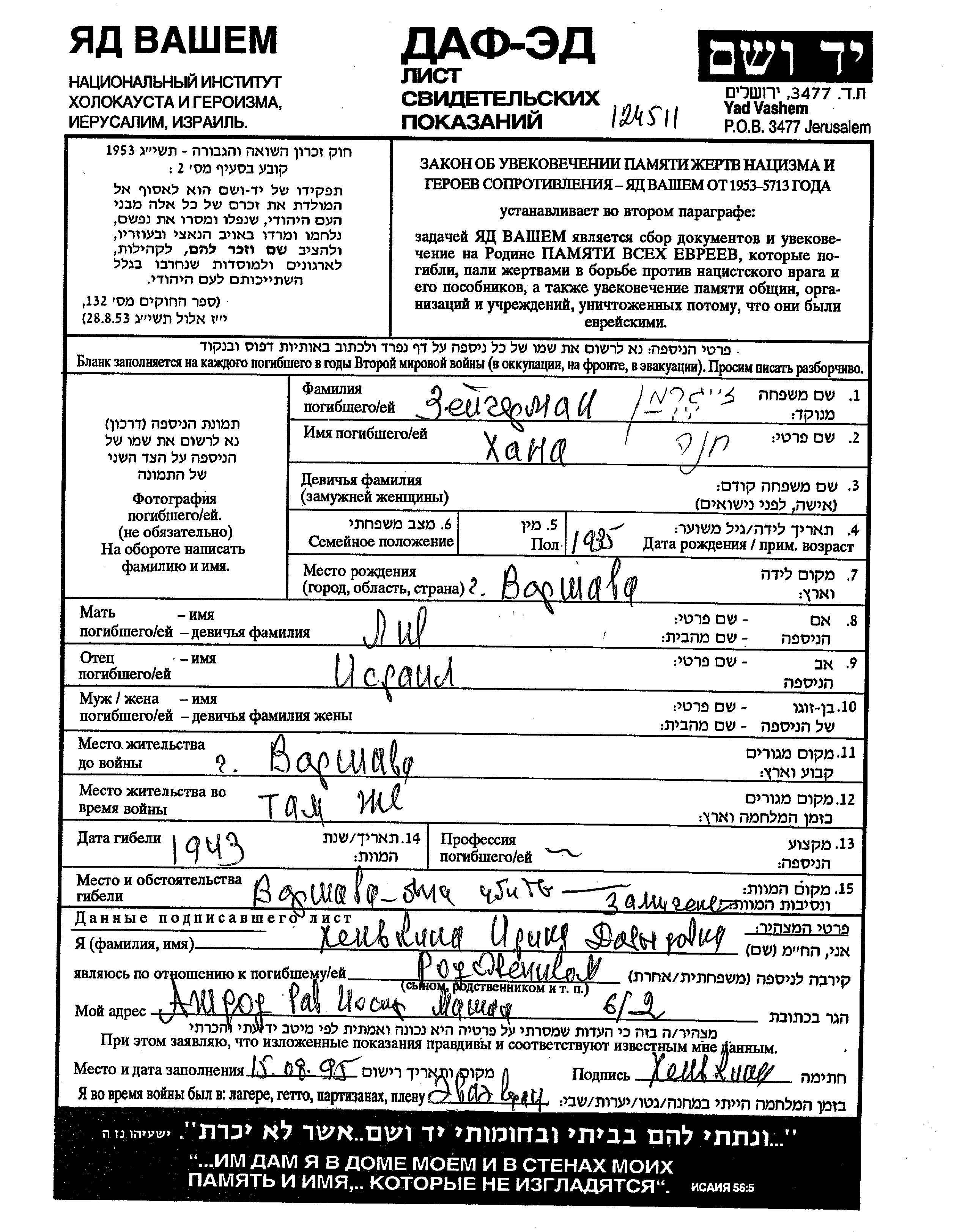 Khana Zeygerman wurde im Jahr 1935 in Warszawa, Polen geboren. Sie war die Tochter von Israil und Lia, geb. Shifryn. Sie war Kind. Vor dem Zweiten Weltkrieg lebte sie in Warszawa, Polen. Während des Krieges war sie in Warszawa, Polen.