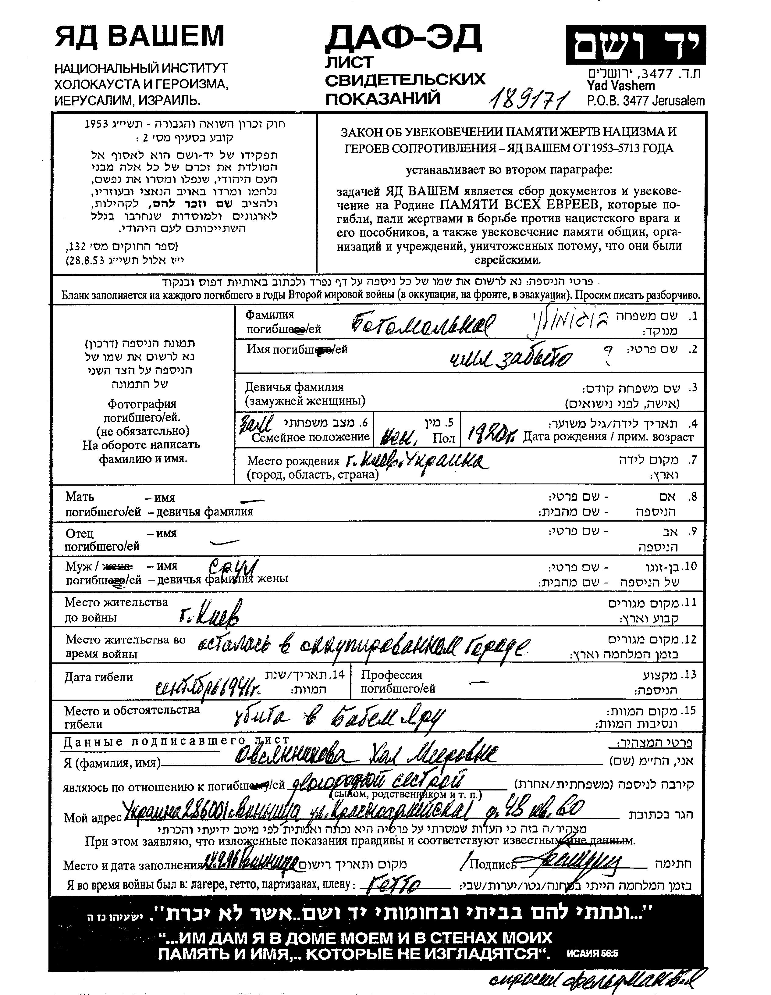 Vorname unbekannt Bogomolny wurde im Jahr 1920 in Kiyev, Ukraine (UdSSR) geboren. Sie war Schuster/-in und mit Srul Verheiratet. Vor dem Zweiten Weltkrieg lebte sie in Kiyev, Ukraine (UdSSR). Während des Krieges war sie in Kiyev, Ukraine (UdSSR).