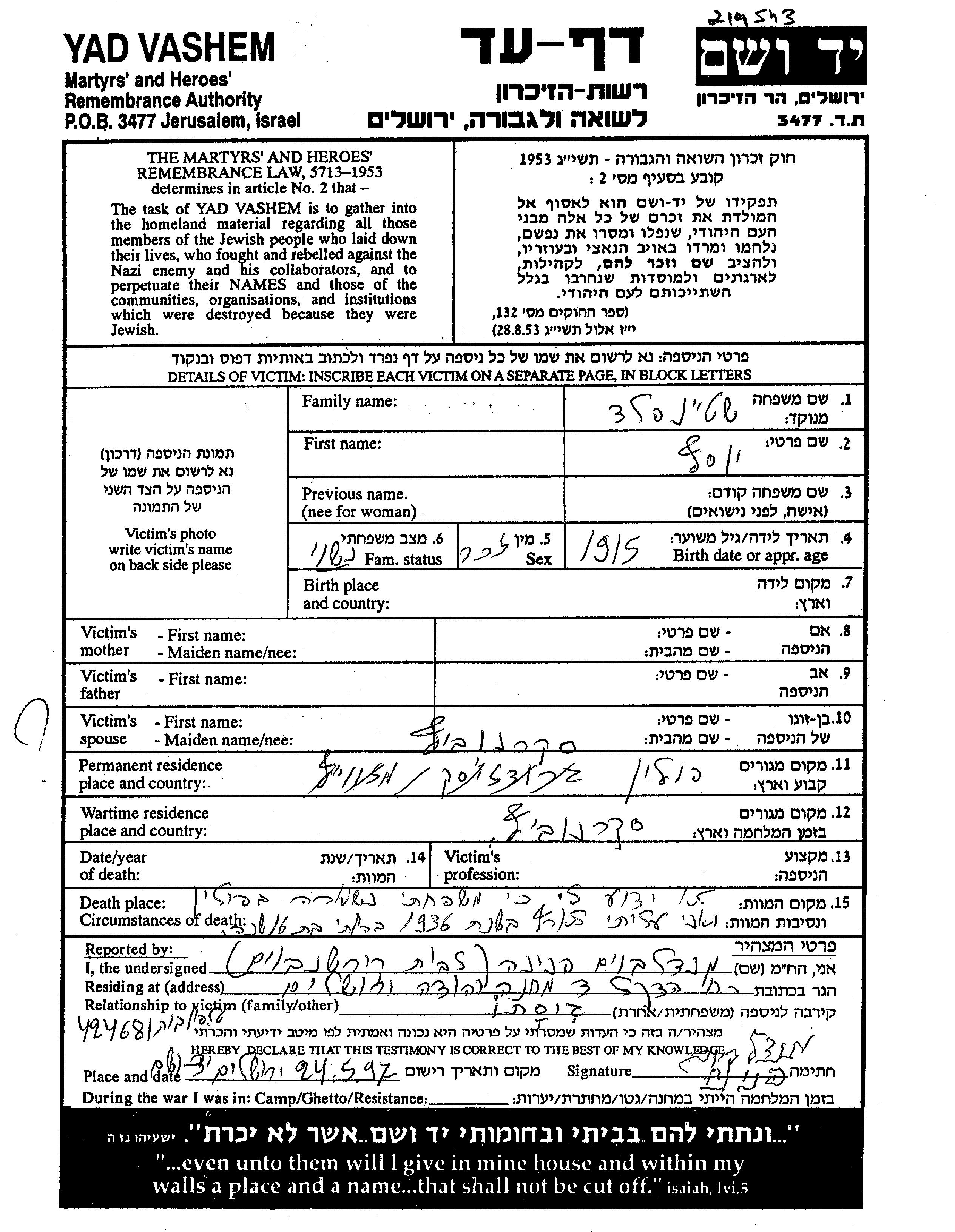 Yosef Shteinfeld wurde im Jahr 1915 geboren. Er war Verheiratet.