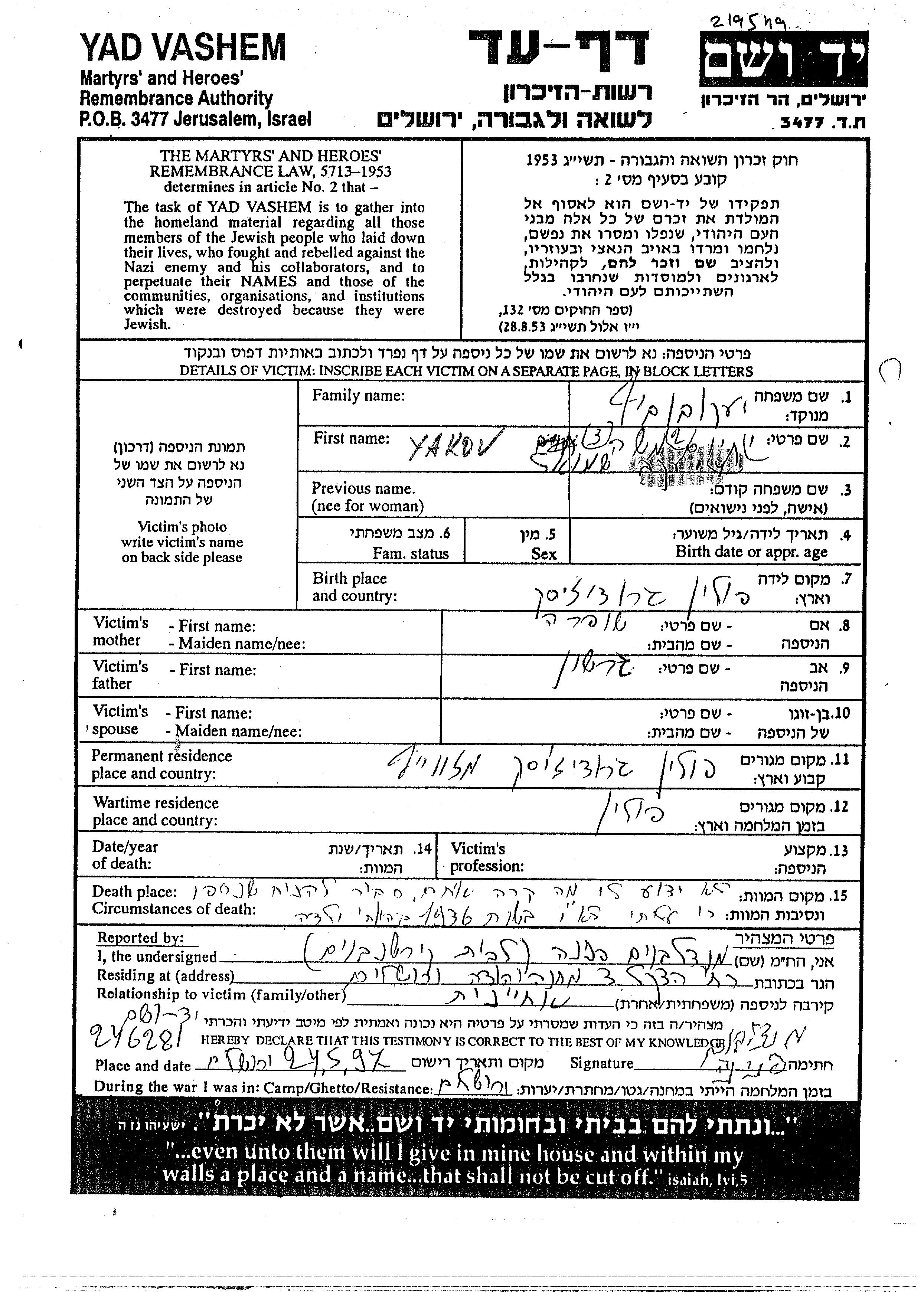 Yakov Yakubovich wurde in Grodzisk Mazowiecki, Polen geboren. Er war der Sohn von Gershon und Shifra. Vor dem Zweiten Weltkrieg lebte er in Grodzisk Mazowiecki, Polen. Während des Krieges war er in Grodzisk Mazowiecki, Polen.