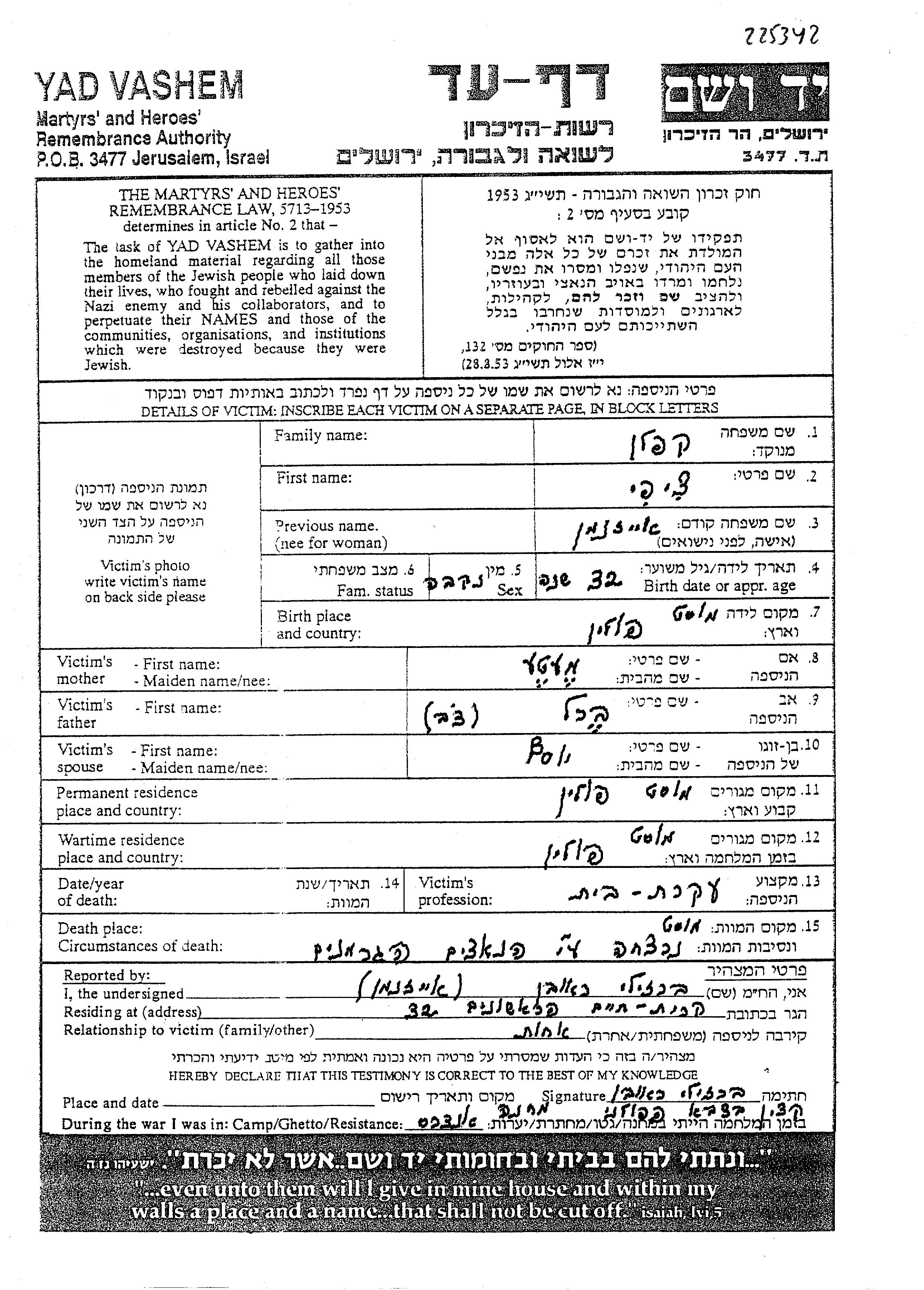 Tzipi Kaplan, geb. Aizenman wurde in Mosty, Polen geboren. Sie war die Tochter von Berl Tzvi und Mete Mate. Sie war Hausfrau und mit Yosef Verheiratet. Vor dem Zweiten Weltkrieg lebte sie in Mosty, Polen. Während des Krieges war sie in Mosty, Polen.