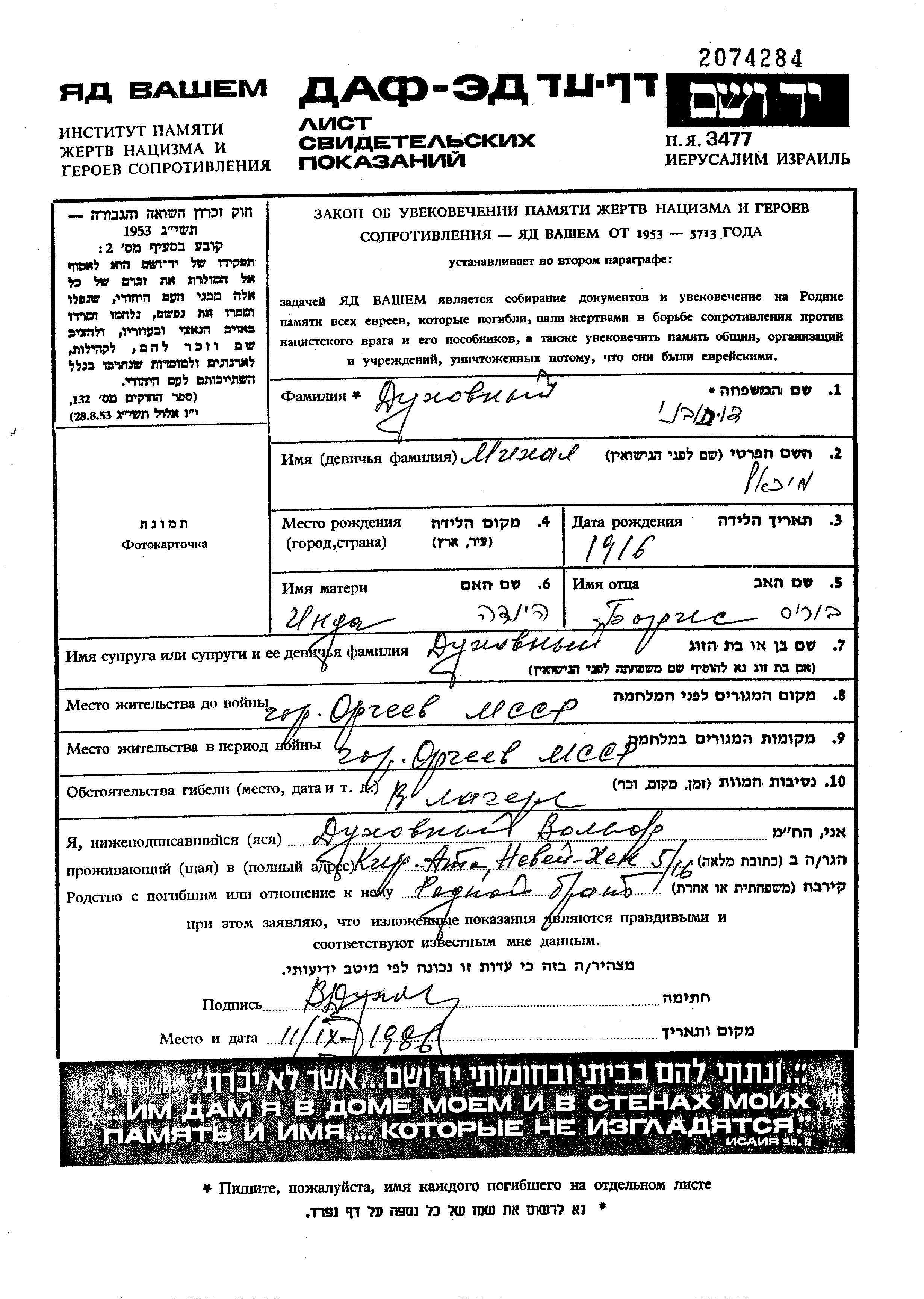 Mikhal Dukhovny wurde im Jahr 1916 geboren. Er war der Sohn von Boris und Inda. Vor dem Zweiten Weltkrieg lebte er in Orhei, Rumänien. Während des Krieges war er in Orhei, Rumänien.