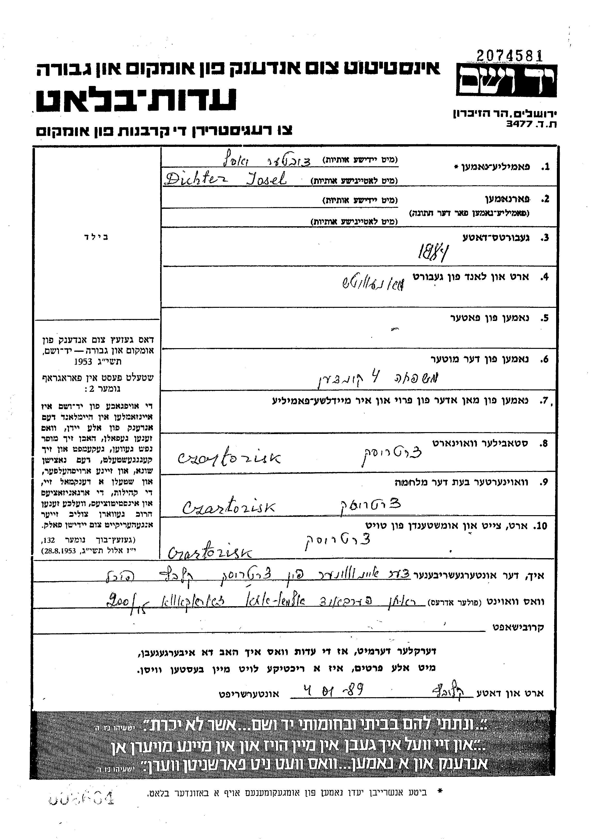 Josel Dichter wurde im Jahr 1884 in Maniewicze, Polen geboren. Er war Verheiratet. Vor dem Zweiten Weltkrieg lebte er in Czartorysk, Polen. Während des Krieges war er in Czartorysk, Polen.