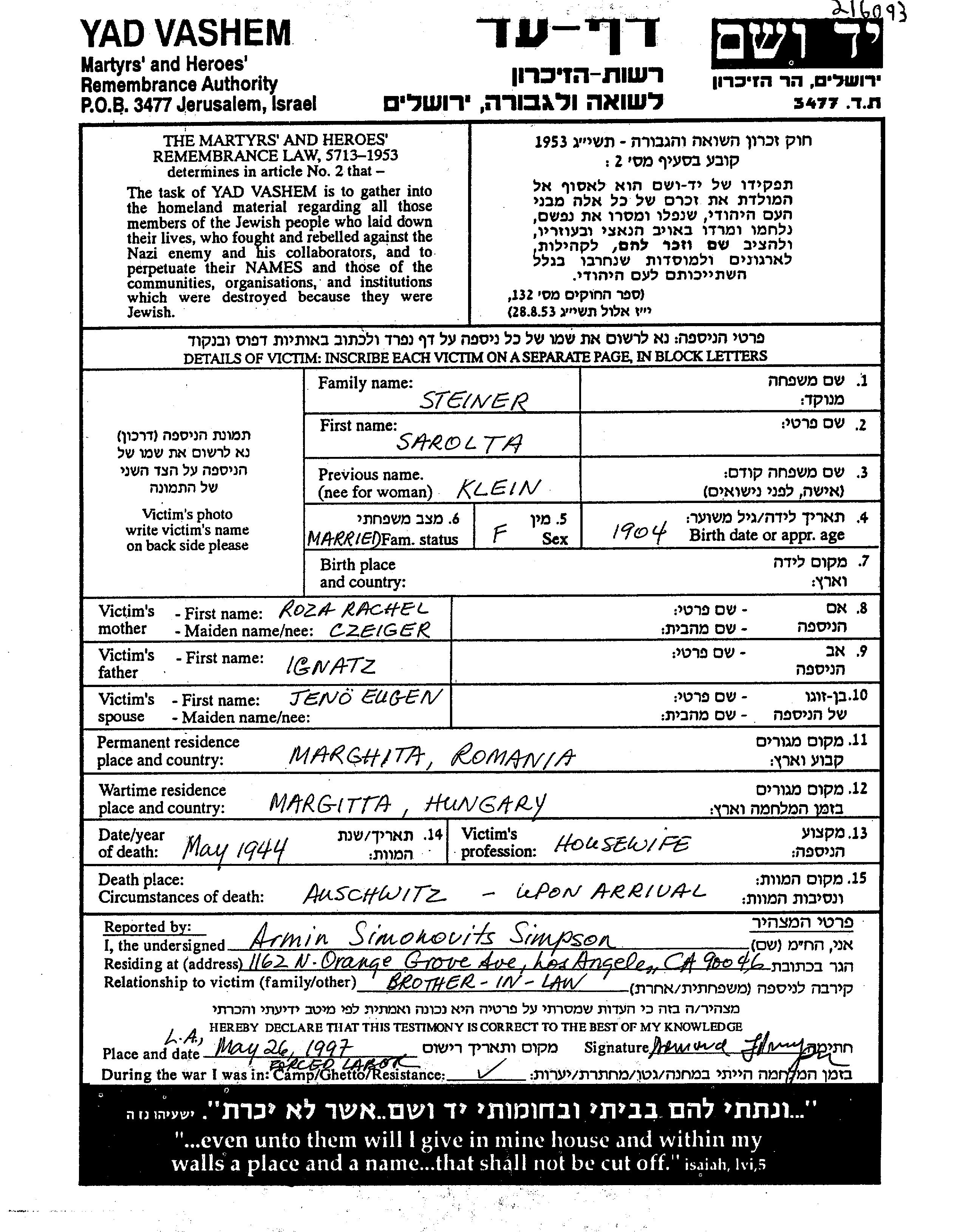 Sarolta Sara Steiner, geb. Klein wurde im Jahr 1904 geboren. Sie war die Tochter von Ignatz und Rachel Roza, geb. Czeiger. Sie war Hausfrau und mit Jeno Eugen Verheiratet. Vor dem Zweiten Weltkrieg lebte sie in Marghita, Rumänien. Während des Krieges war sie in Marghita, Rumänien.