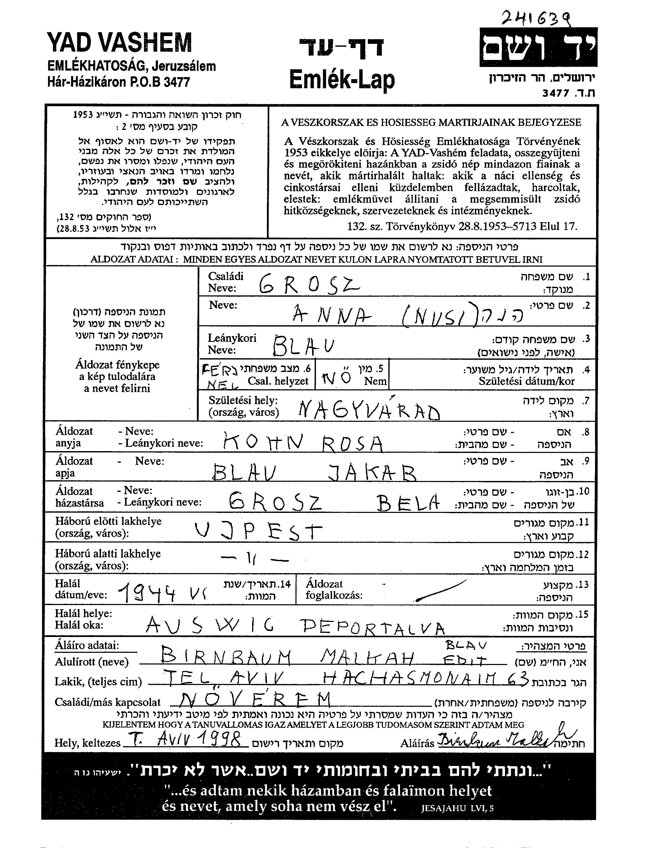 Grosz Anna Khana Ujpest, Ungarn Gedenkblatt