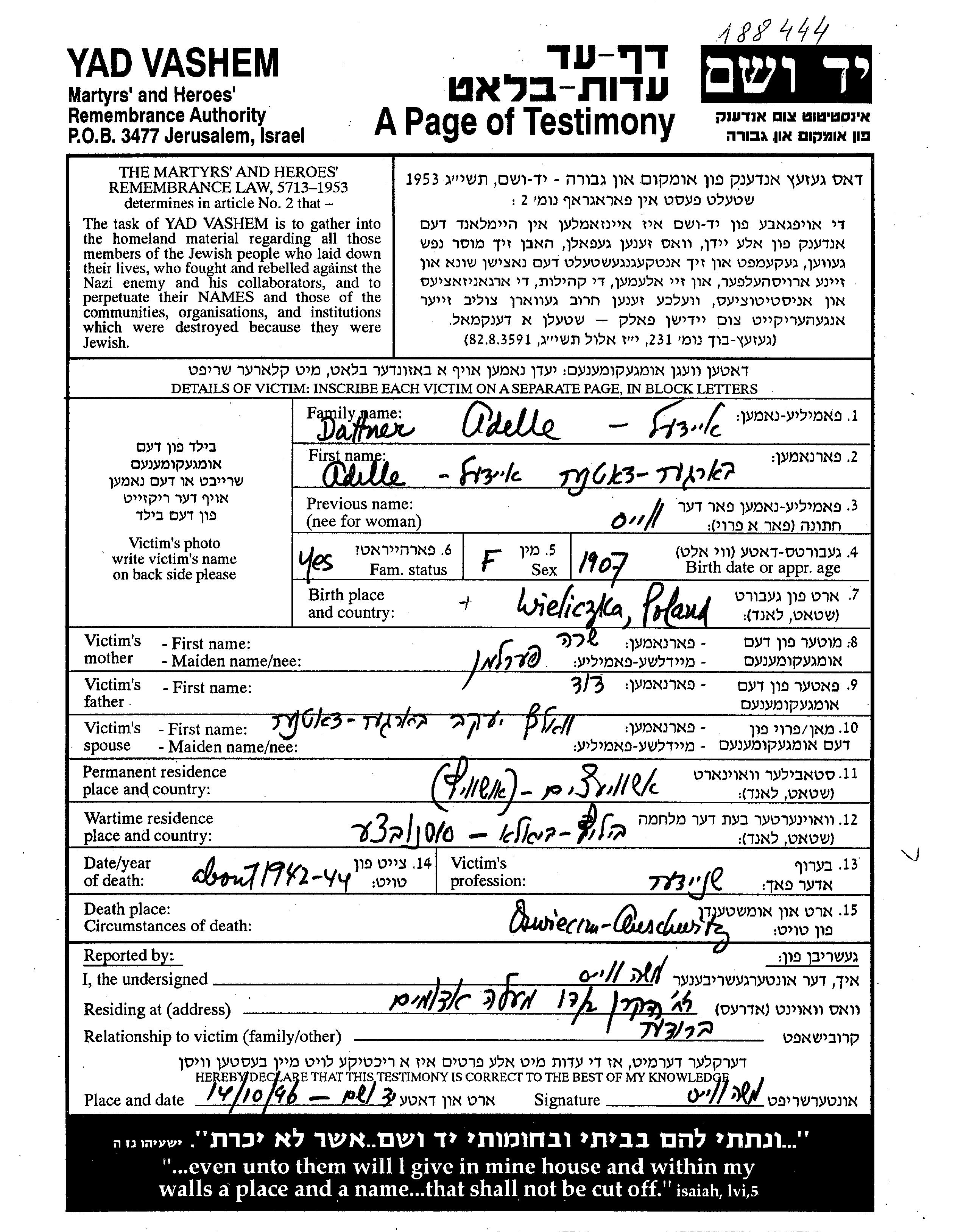 Adelle Dattner Barger, geb. Vais wurde im Jahr 1907 in Wieliczka, Polen geboren. Sie war die Tochter von David und Sara, geb. Perlman. Sie war Schneiderin und mit Yakov Volf Verheiratet. Vor dem Zweiten Weltkrieg lebte sie in Oświęcim, Polen. Während des Krieges war sie in Sosnowice, Polen.