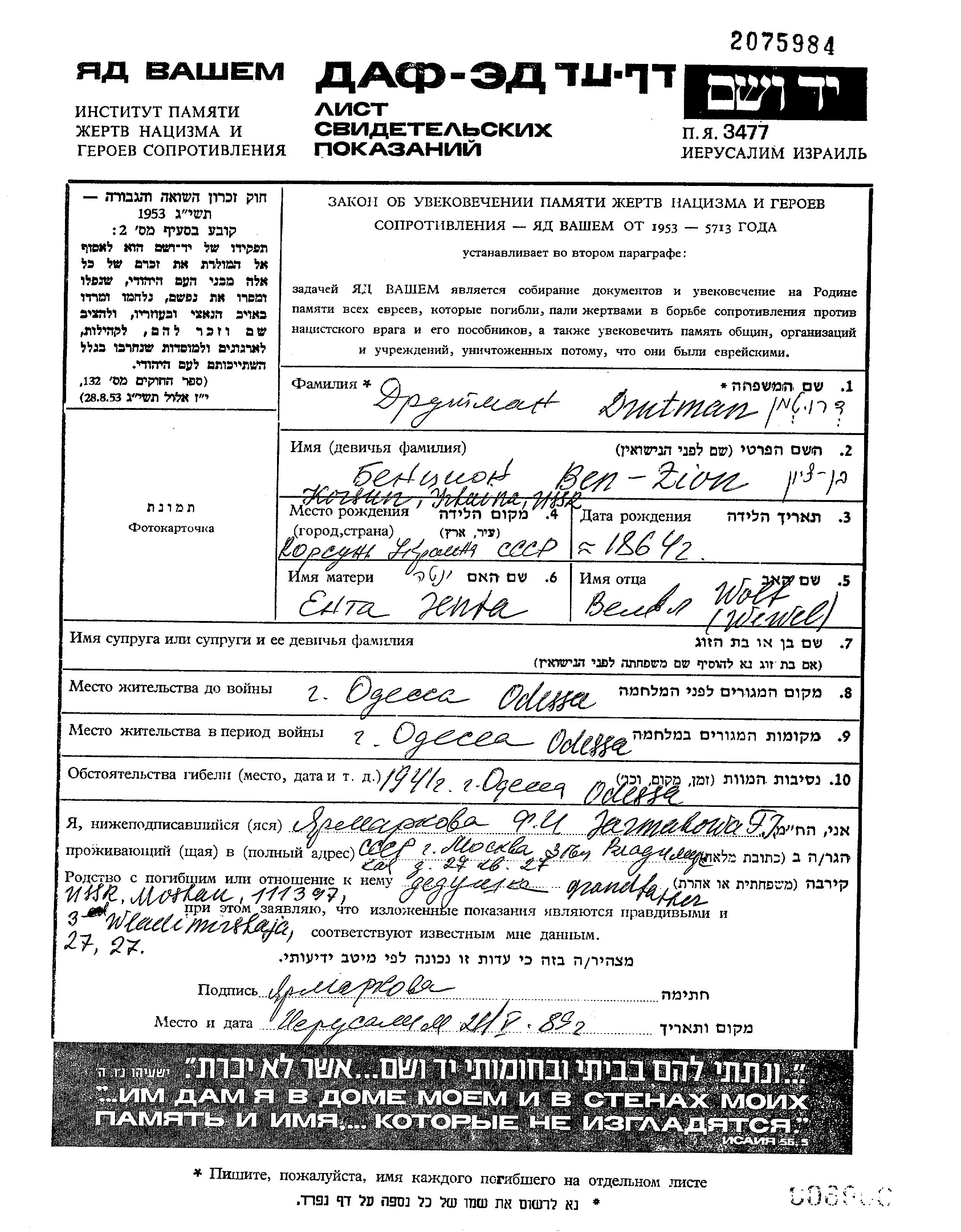 Ben Zion wurde in der Schoah ermordet. Todesort: Odessa, Ukraine (UdSSR).