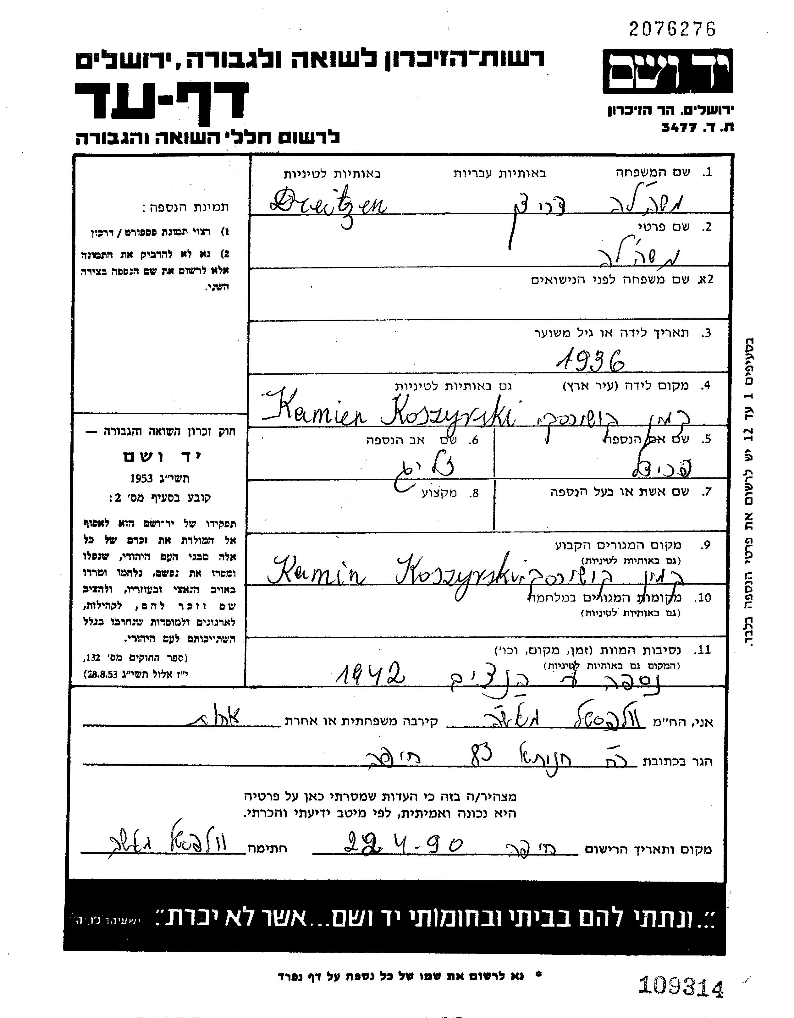 Moshele Dreitzen wurde im Jahr 1936 in Kamien Koszyrski, Polen geboren. Er war der Sohn von Zelig und Fridl, geb. Plot. Er war Kind. Vor dem Zweiten Weltkrieg lebte er in Kamien Koszyrski, Polen.