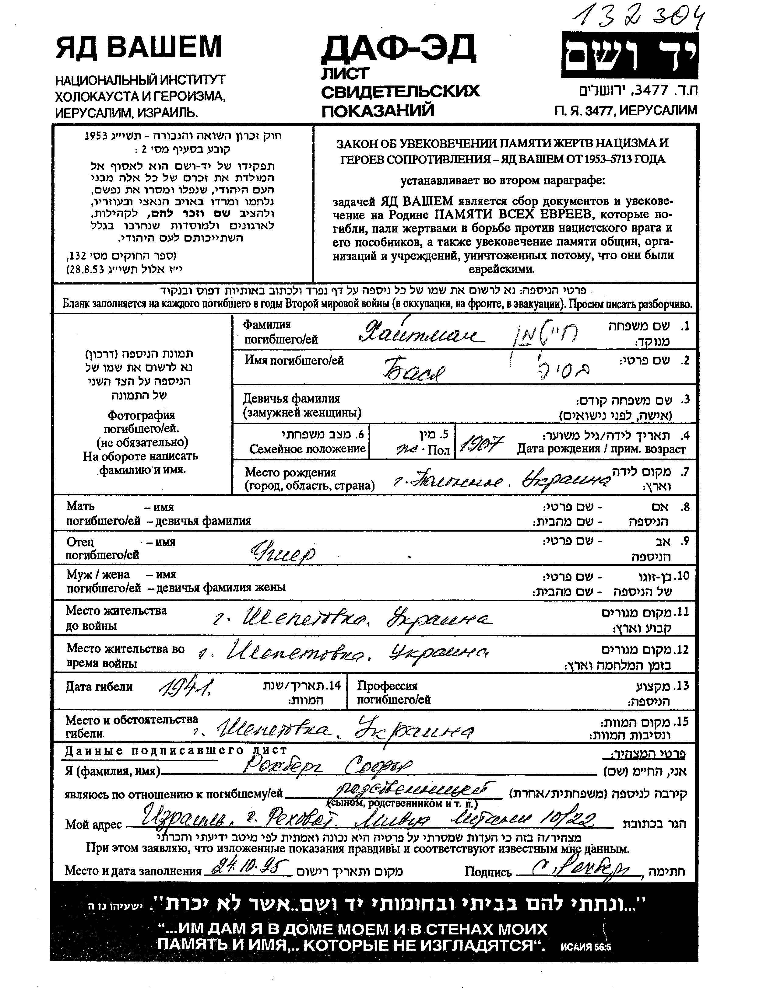 Khaitman Basia 1907 Shepetovka, Ukraine (UdSSR) Gedenkblatt