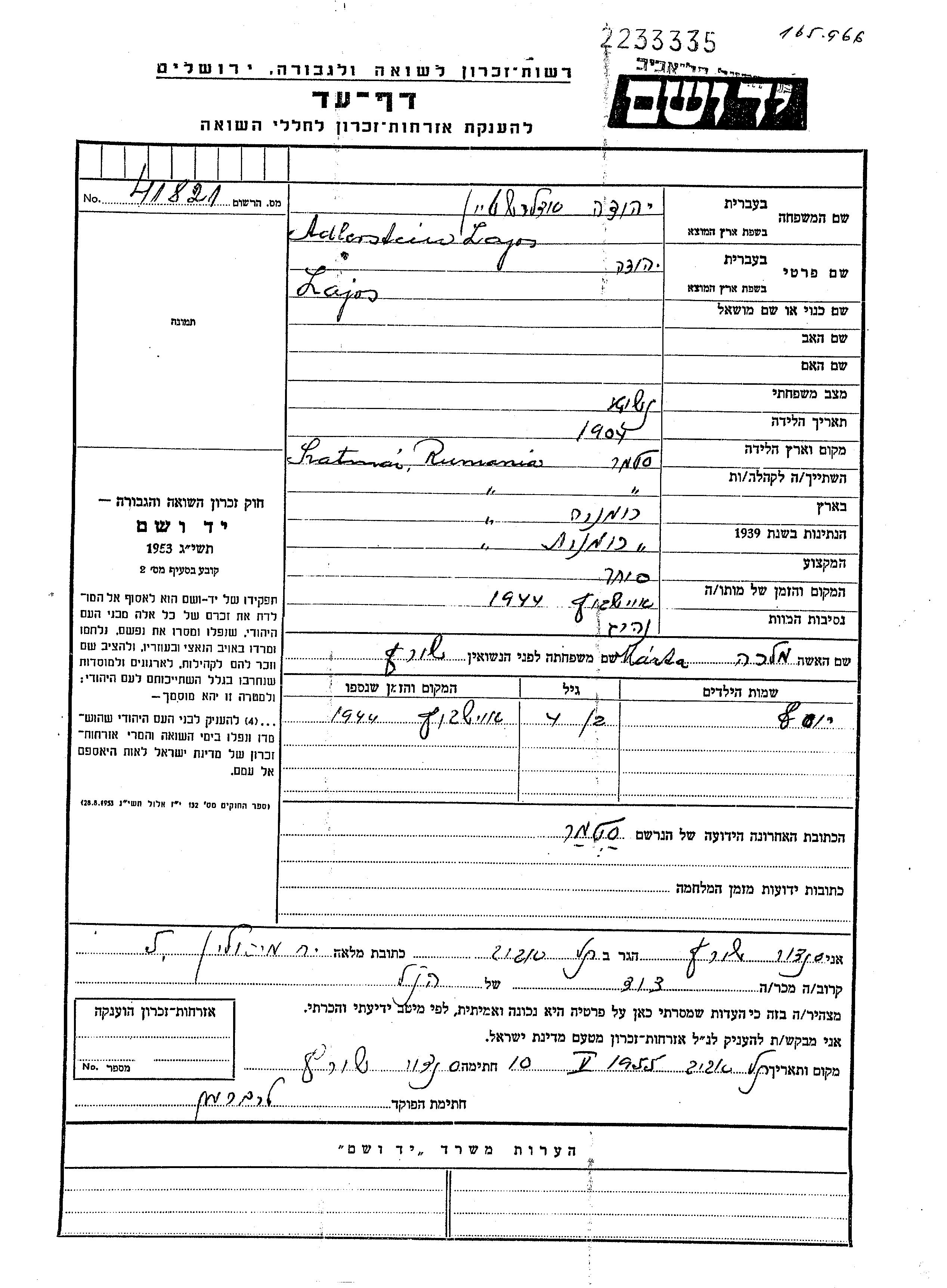 Yosef Adlerstein wurde im Jahr 1940 geboren. Er war der Sohn von Yehuda Lajos und Malka Marta, geb. Shvartz. Er war Kind. Vor dem Zweiten Weltkrieg lebte er in Szatmarnemeti, Rumänien. Während des Krieges war er in Szatmarnemeti, Rumänien.