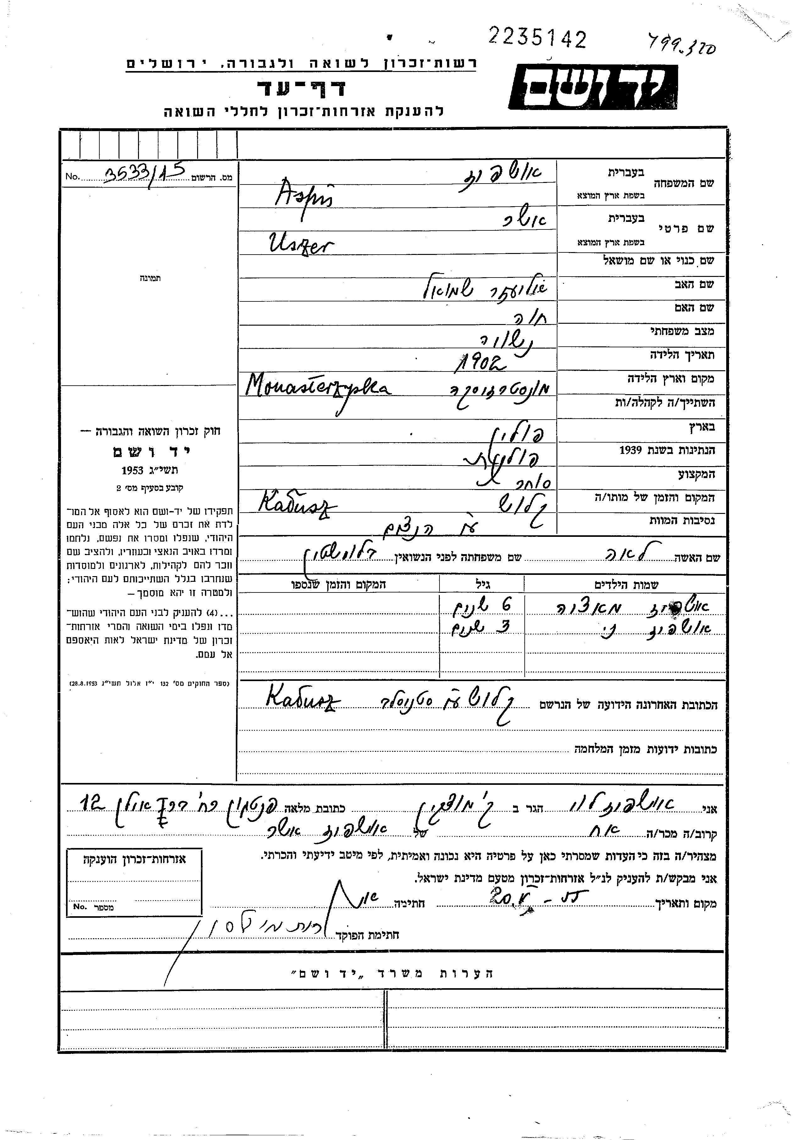 Uszer wurde in der Schoah ermordet. Todesort: Kalusz, Polen.