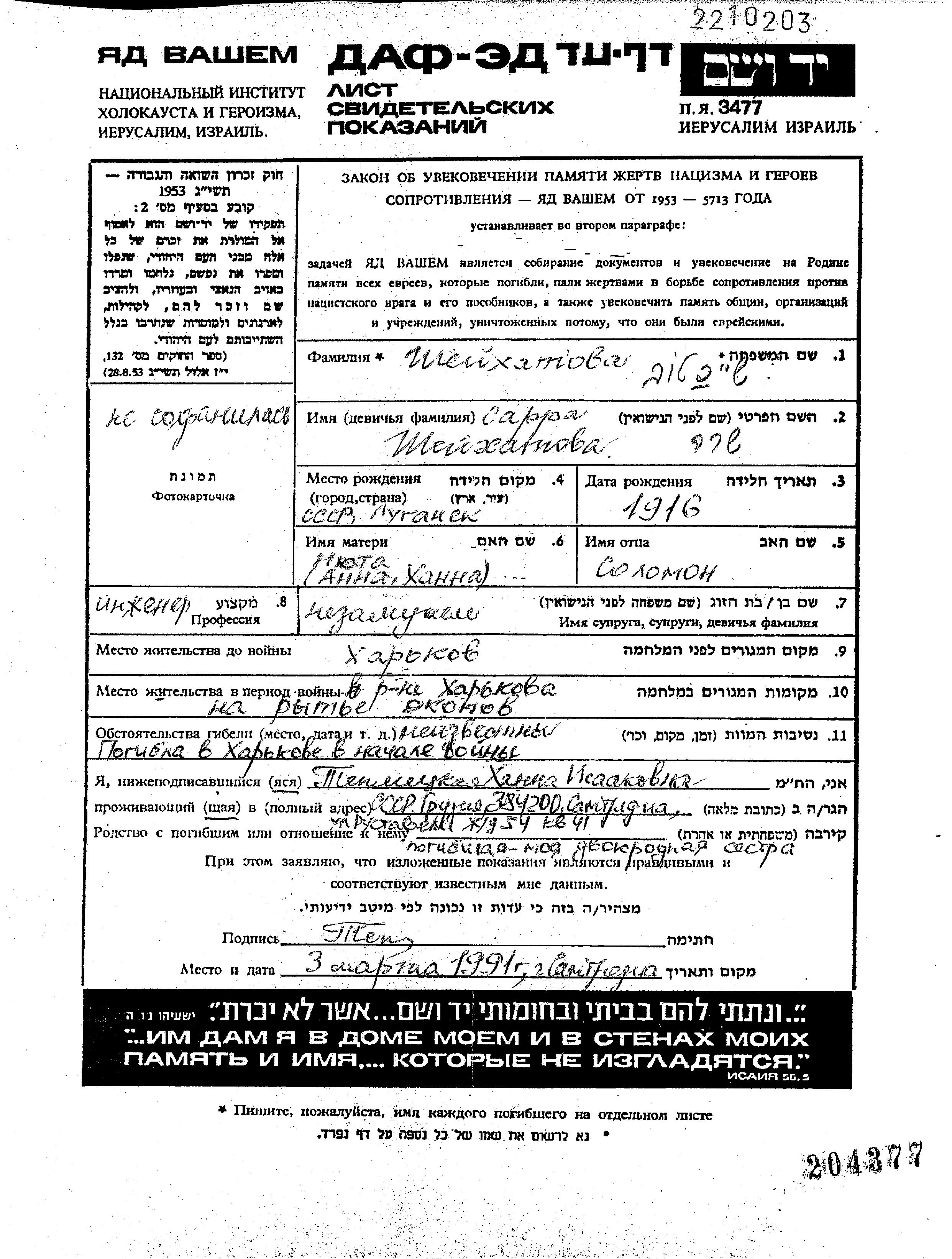Sarra wurde in der Schoah ermordet. Todesort: Kharkov, Ukraine (UdSSR).