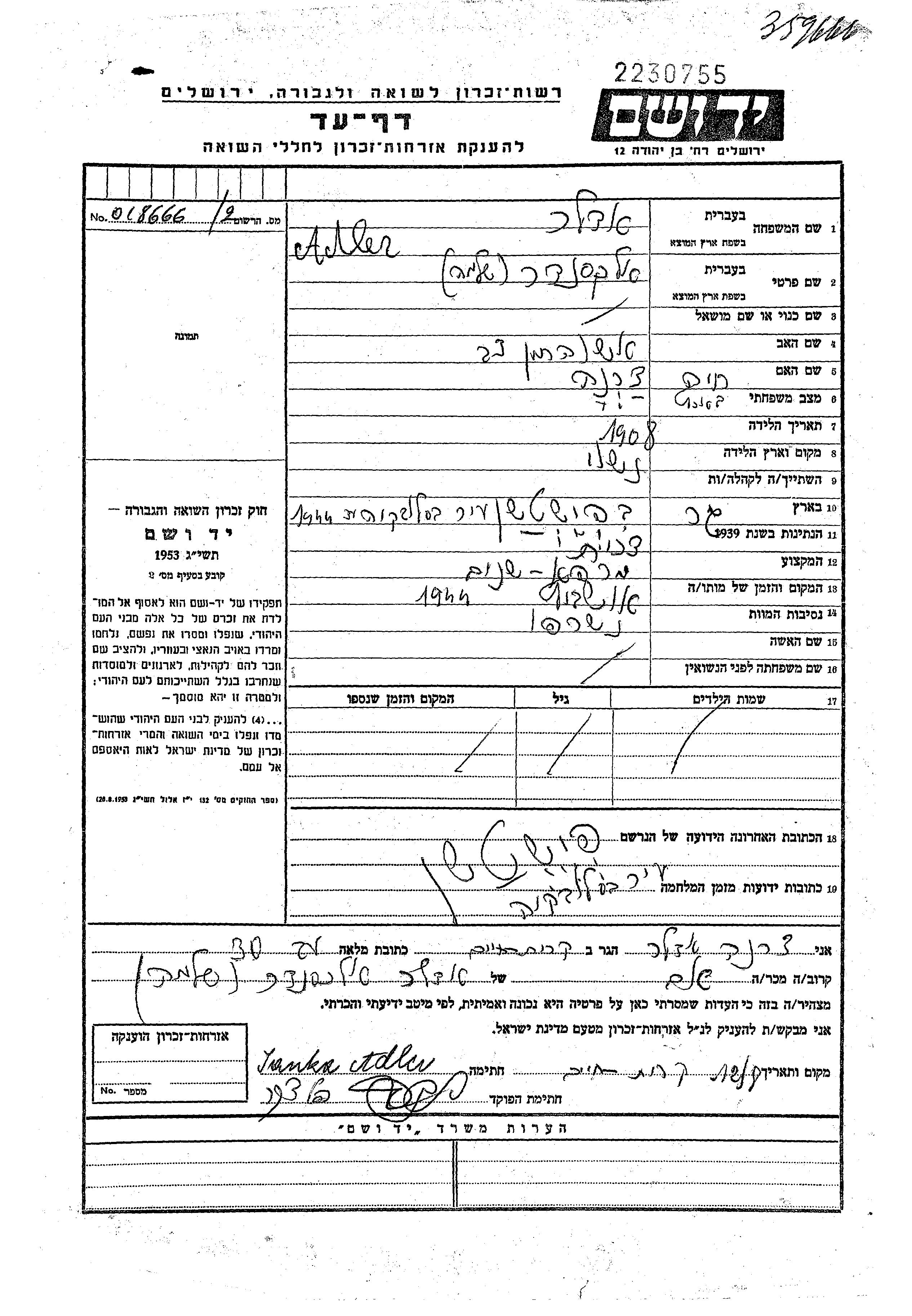 Aleksander Adler wurde im Jahr 1908 in Piestany, Tschechoslowakei geboren. Er war der Sohn von Asher Herman Tzvi und Charna Khaia. Er war Zahnarzt/-ärztin und Verheiratet. Vor dem Zweiten Weltkrieg lebte er in Piestany, Tschechoslowakei. Während des Krieges war er in Piestany, Tschechoslowakei.