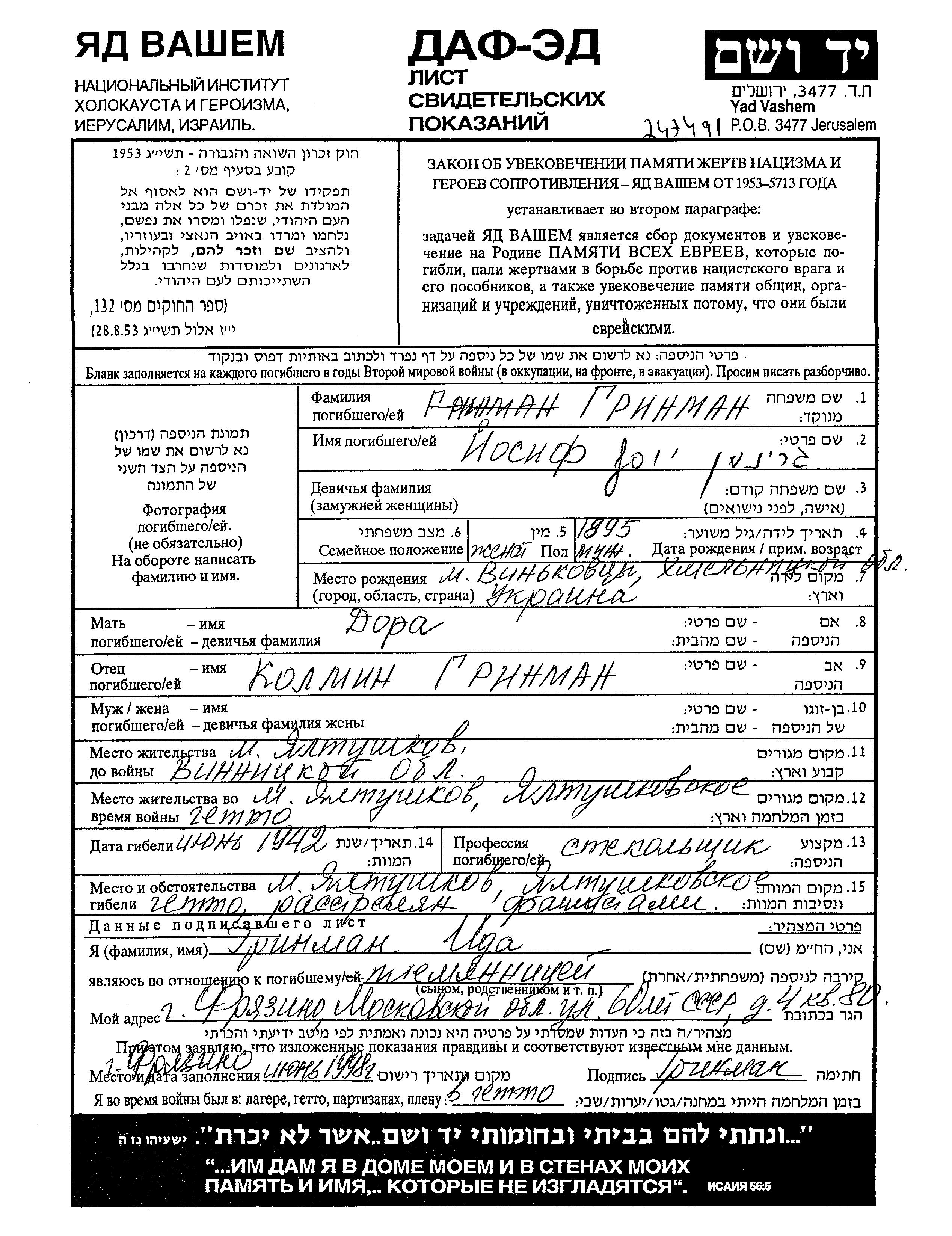 Iosif Grinman wurde im Jahr 1895 in Vinkovtsy, Ukraine (UdSSR) geboren. Er war der Sohn von Kolmin und Dora. Er war Glaser/-in und Verheiratet. Vor dem Zweiten Weltkrieg lebte er in Yaltushkov, Ukraine (UdSSR). Während des Krieges war er in Yaltushkov, Ukraine (UdSSR).