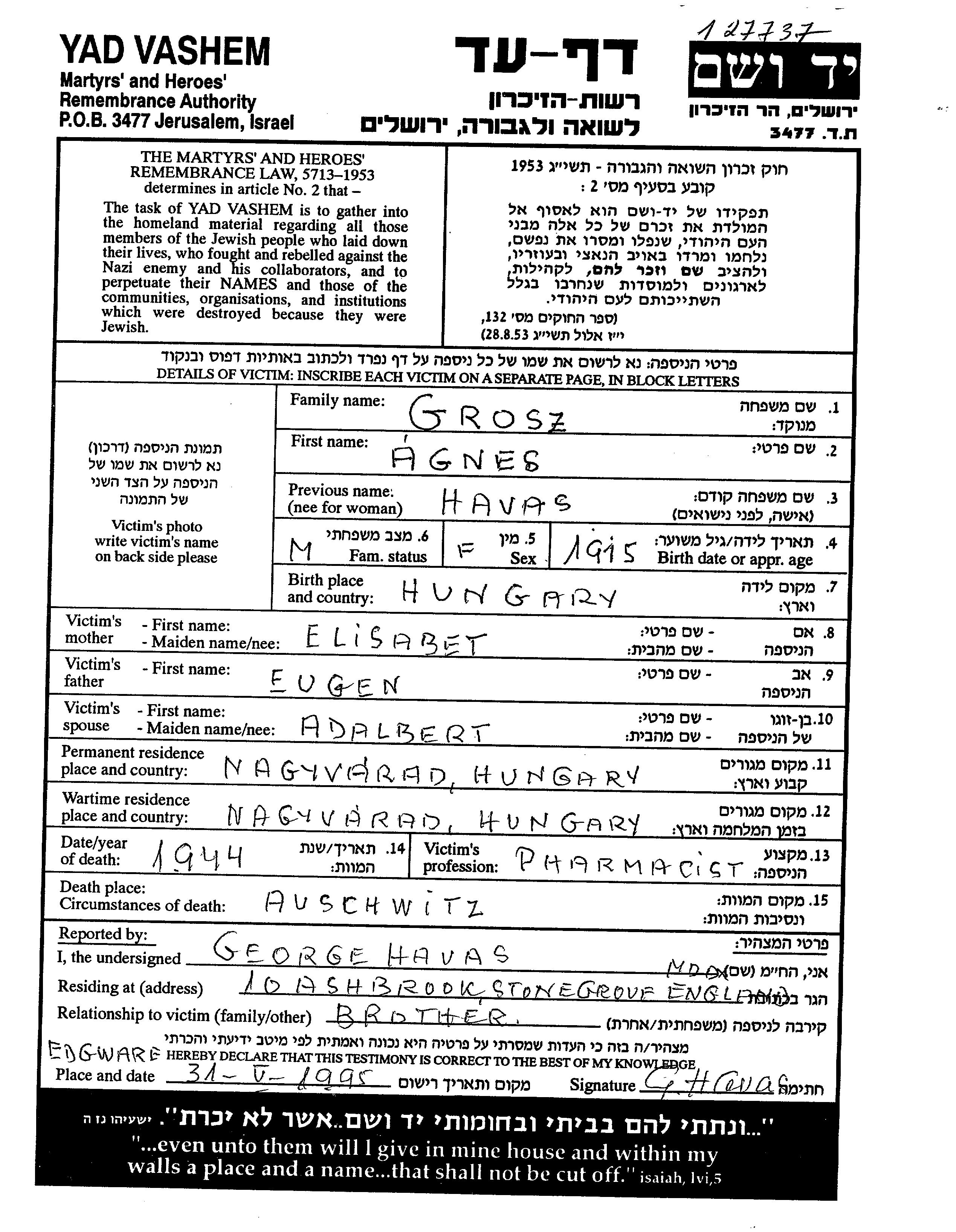 Agneta Grosz, geb. Havas wurde im Jahr 1915 in Ungarn geboren. Sie war die Tochter von Eugen Jeno und Elisabet, geb. Schütz. Sie war Apotheker/-in und mit Adalbert Verheiratet. Vor dem Zweiten Weltkrieg lebte sie in Nagyvarad, Rumänien. Während des Krieges war sie in Nagyvarad, Rumänien.