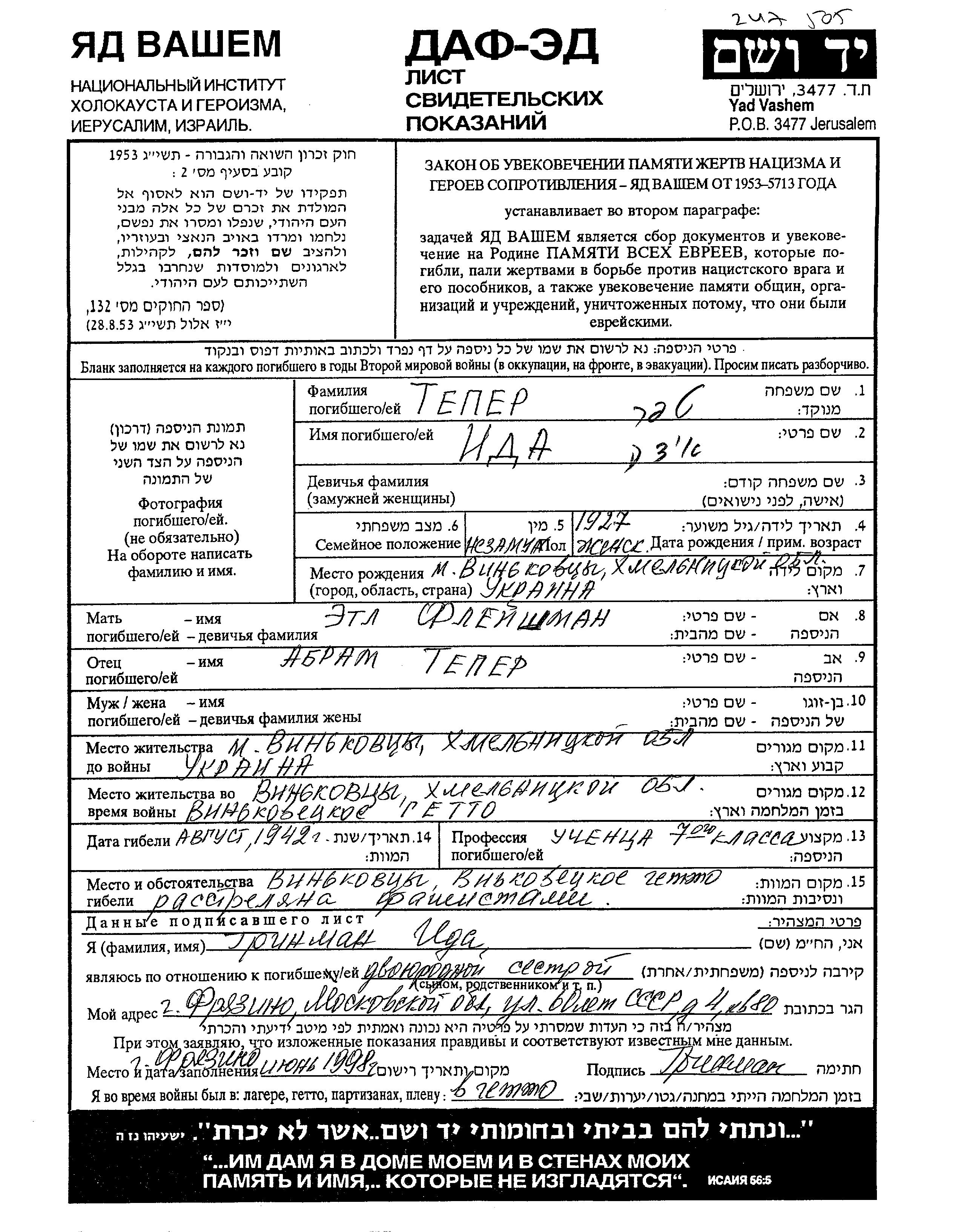 Ida Teper wurde im Jahr 1927 in Vinkovtsy, Ukraine (UdSSR) geboren. Sie war die Tochter von Abram und Etl, geb. Fleishman. Sie war Schüler/-in und Kind. Vor dem Zweiten Weltkrieg lebte sie in Vinkovtsy, Ukraine (UdSSR). Während des Krieges war sie in Vinkovtsy, Ukraine (UdSSR).