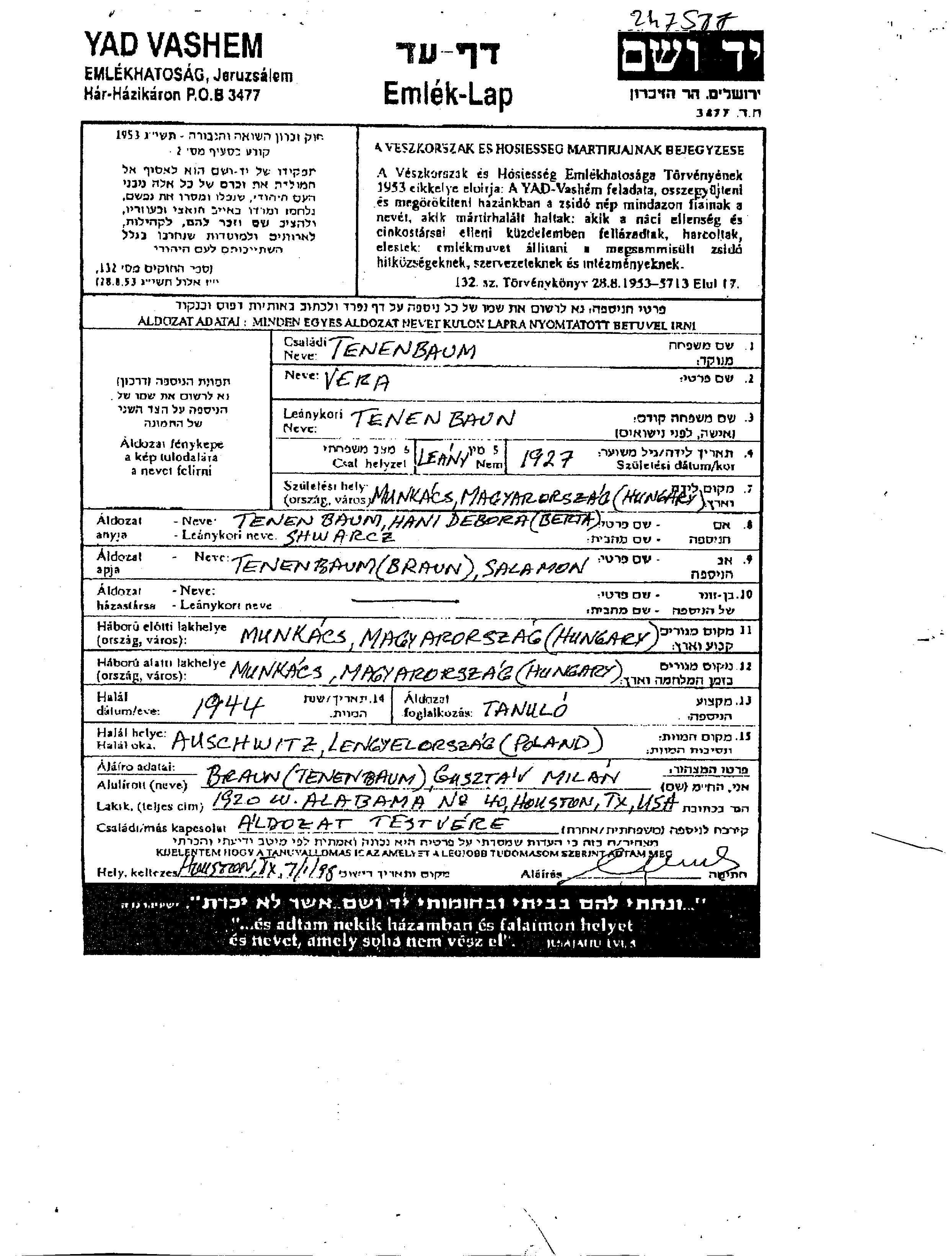 Tenenbaum Braun Vera 1927 Munkacs, Tschechoslowakei Gedenkblatt
