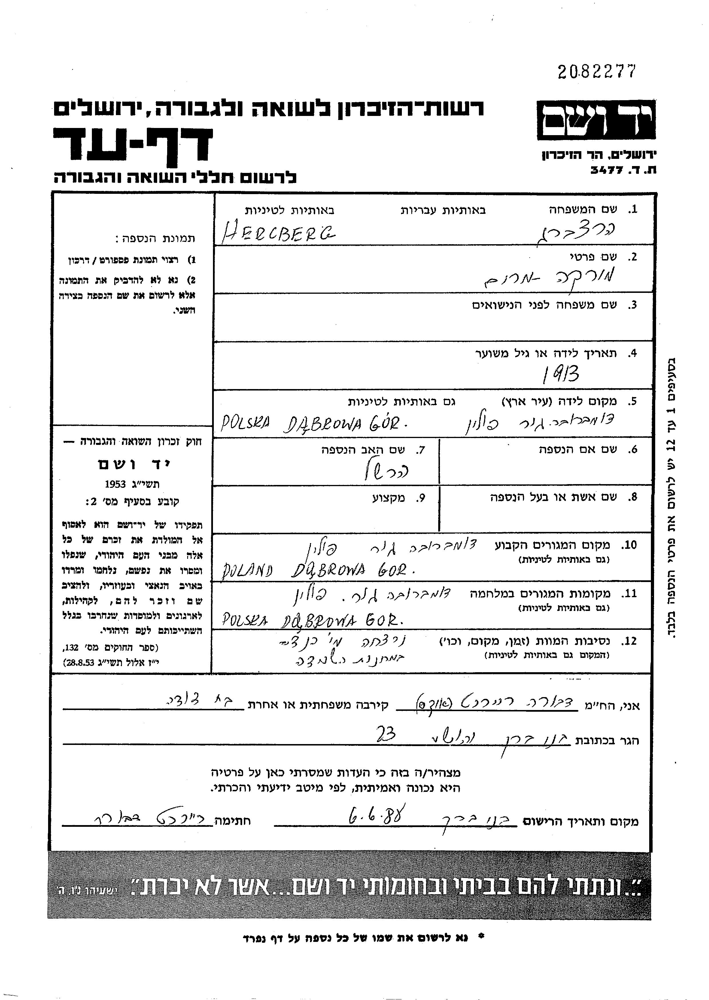 Hercberg Mirka Miriam Dabrowa Gornicza, Polen Gedenkblatt