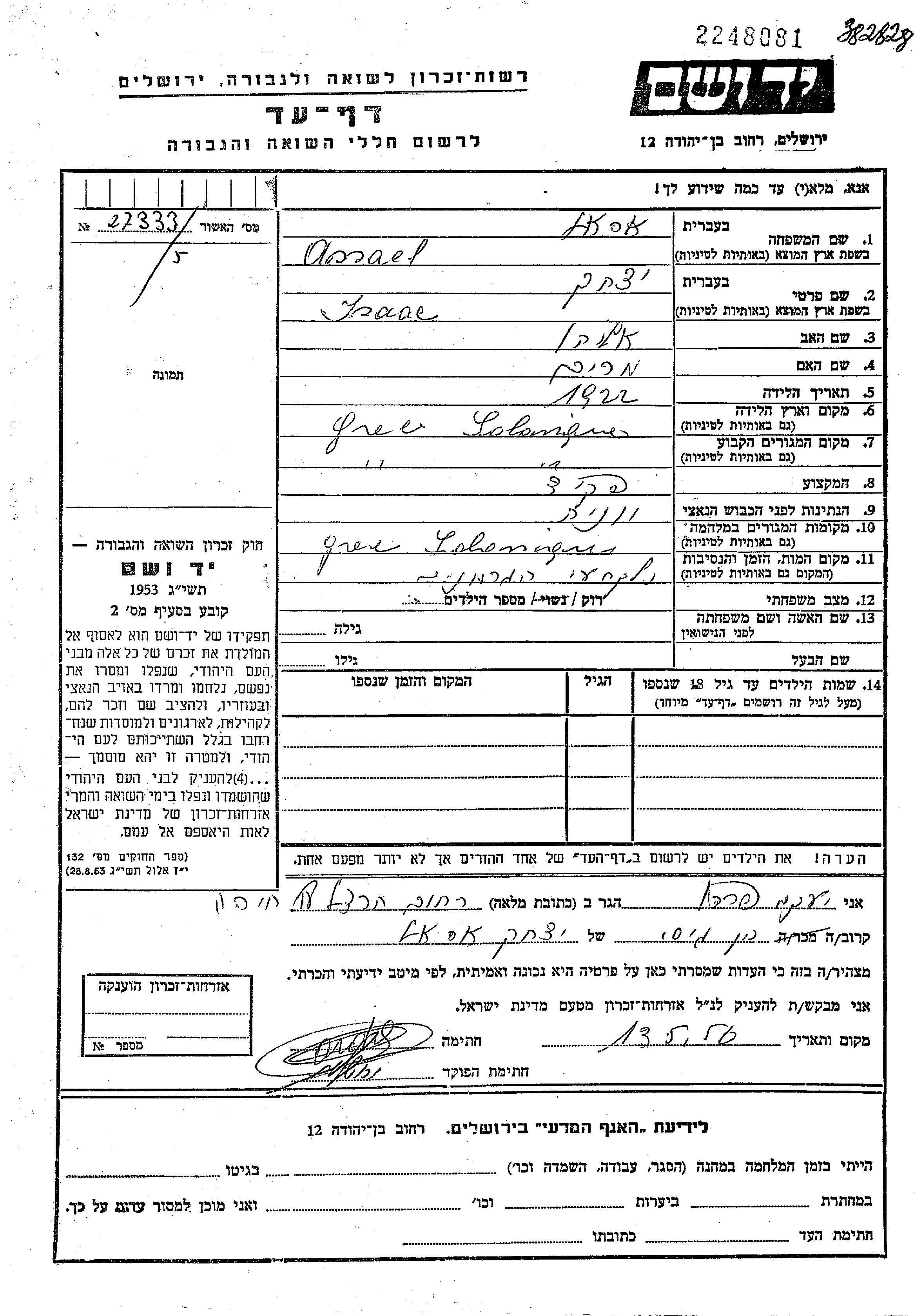 Assael Isaac 1922 Saloniki, Griechenland Gedenkblatt