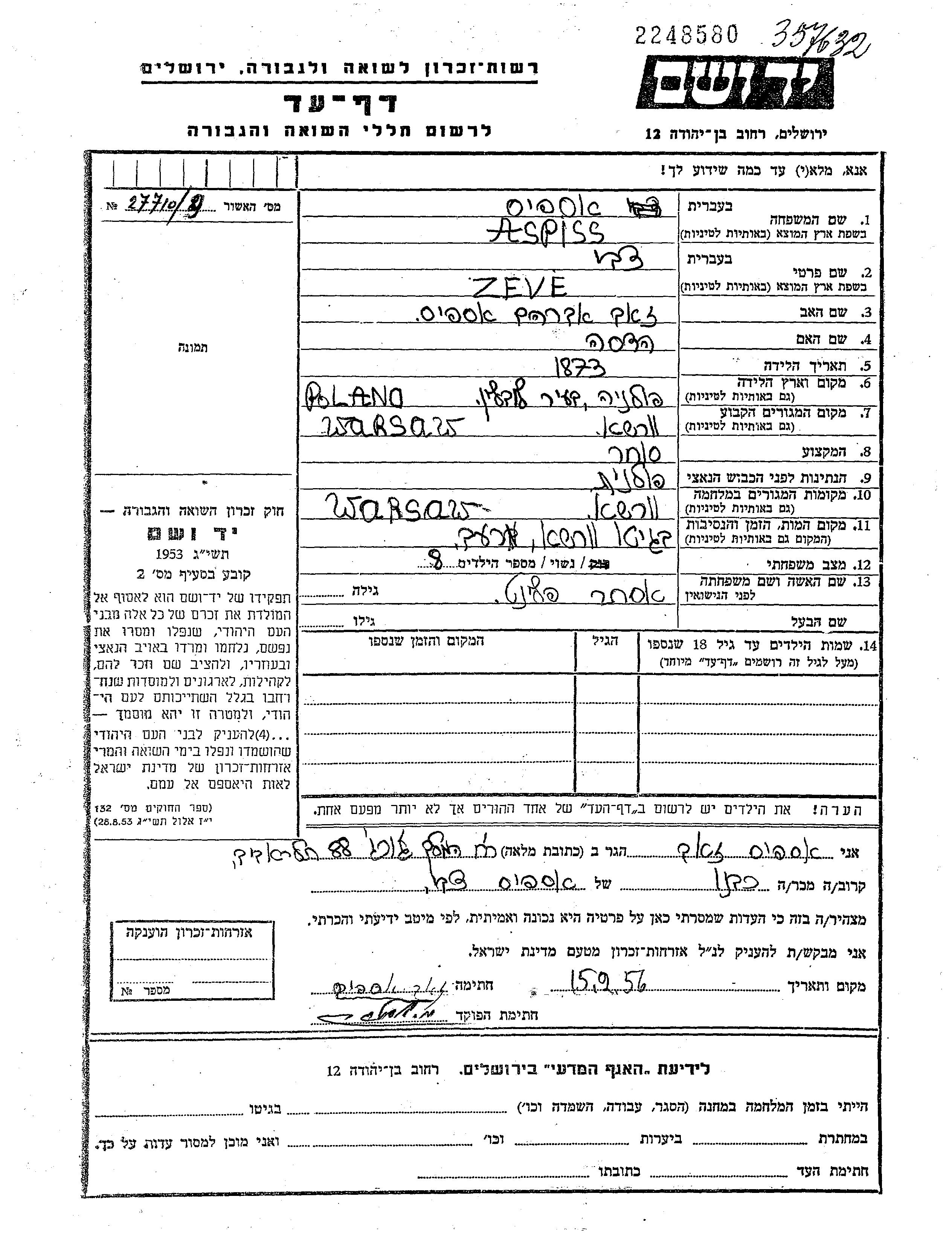 Zeve Tzvi Aspis wurde im Jahr 1873 in Lublin, Polen geboren. Er war der Sohn von Zeev Avraham und Hadasa. Er war Kaufmann/-frau und mit Astar Verheiratet. Vor dem Zweiten Weltkrieg lebte er in Warszawa, Polen. Während des Krieges war er in Warszawa, Polen.