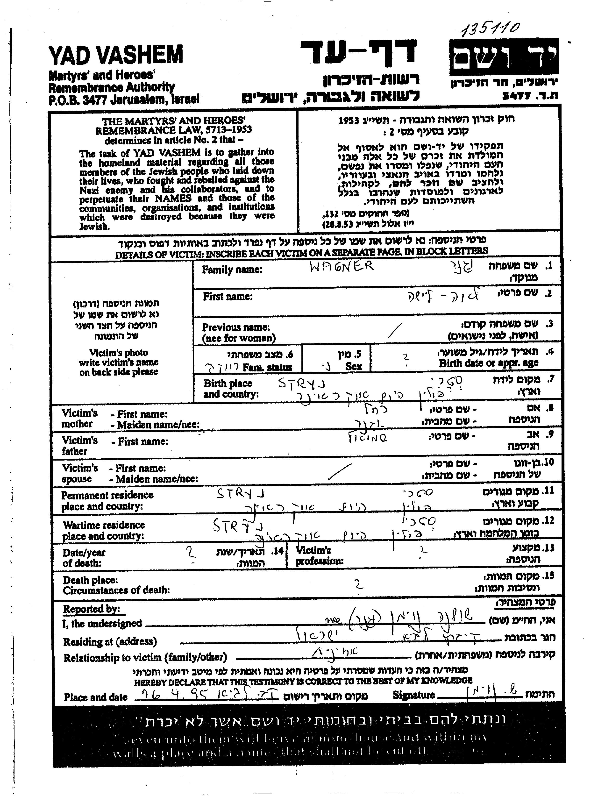 Lea Wagner wurde in Stryj, Polen geboren. Sie war die Tochter von Shmuel und Rakhel. Sie war Ledig. Vor dem Zweiten Weltkrieg lebte sie in Stryj, Polen. Während des Krieges war sie in Stryj, Polen.