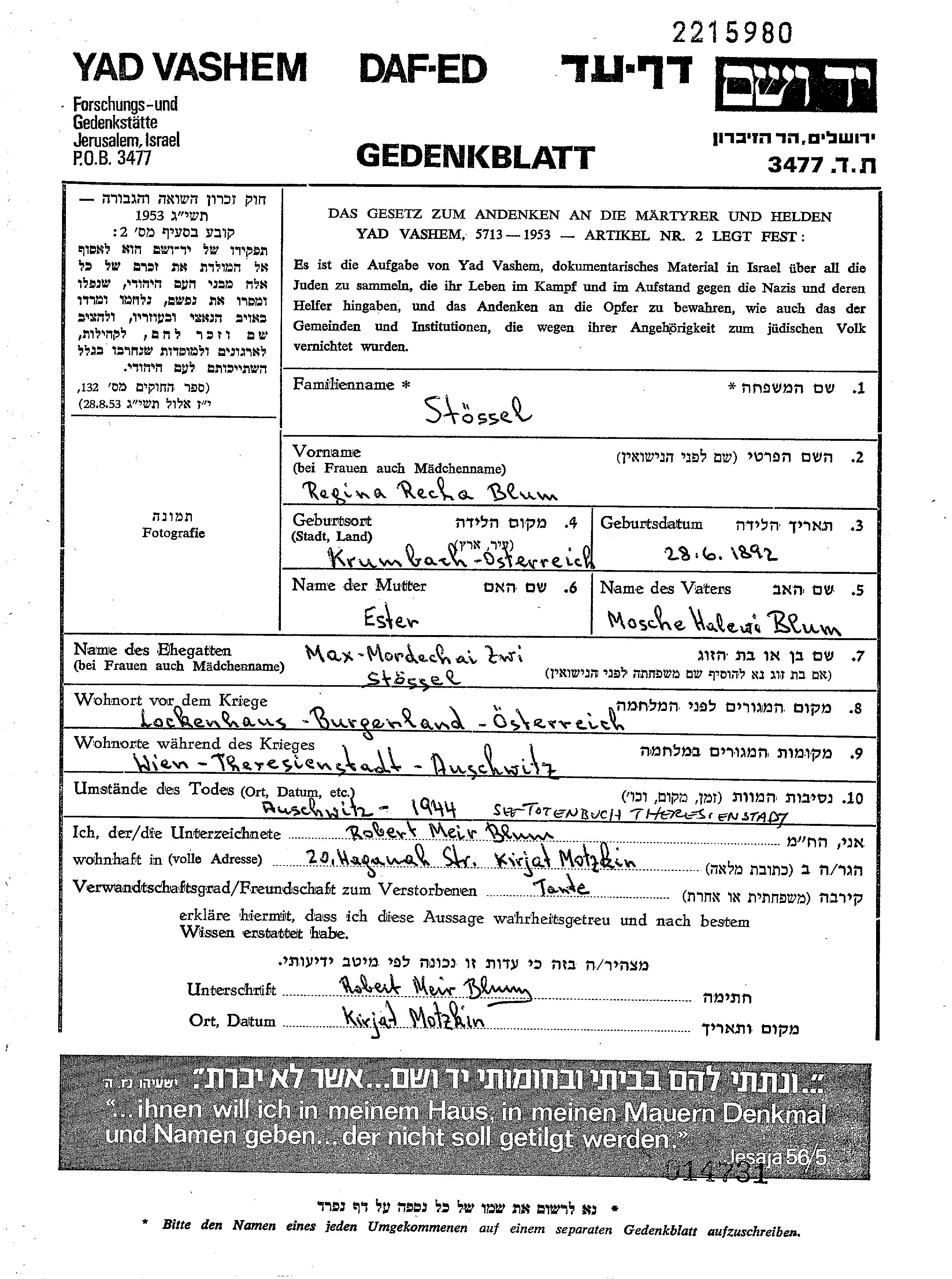 Recha Regina Stössel Shtesel, geb. Blum wurde im Jahr 1892 in Krumbach, Deutsches Reich geboren. Sie war die Tochter von Mosche Halevi und Ester. Sie war mit Max Mordechai Zwi Verheiratet. Vor dem Zweiten Weltkrieg lebte sie in Lockenhaus, Österreich. Während des Krieges war sie in Wien, Österreich.