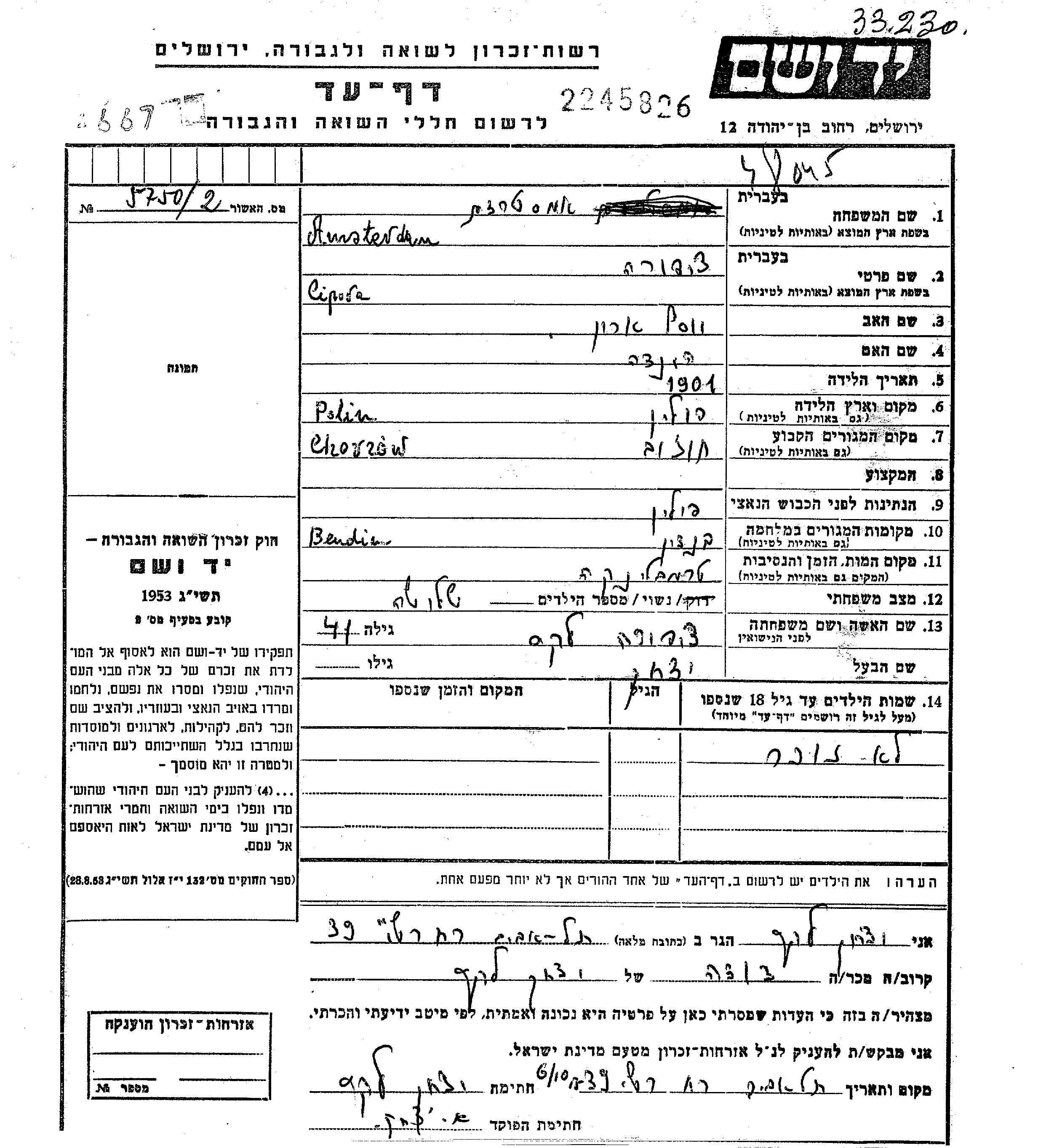 Cipora Amsterdam, geb. Laks wurde im Jahr 1901 in Polen geboren. Sie war die Tochter von Yosef Aharon und Hinda. Sie war mit Yitzkhak Verheiratet. Vor dem Zweiten Weltkrieg lebte sie in Chorzow, Polen. Während des Krieges war sie in Będzin, Polen.