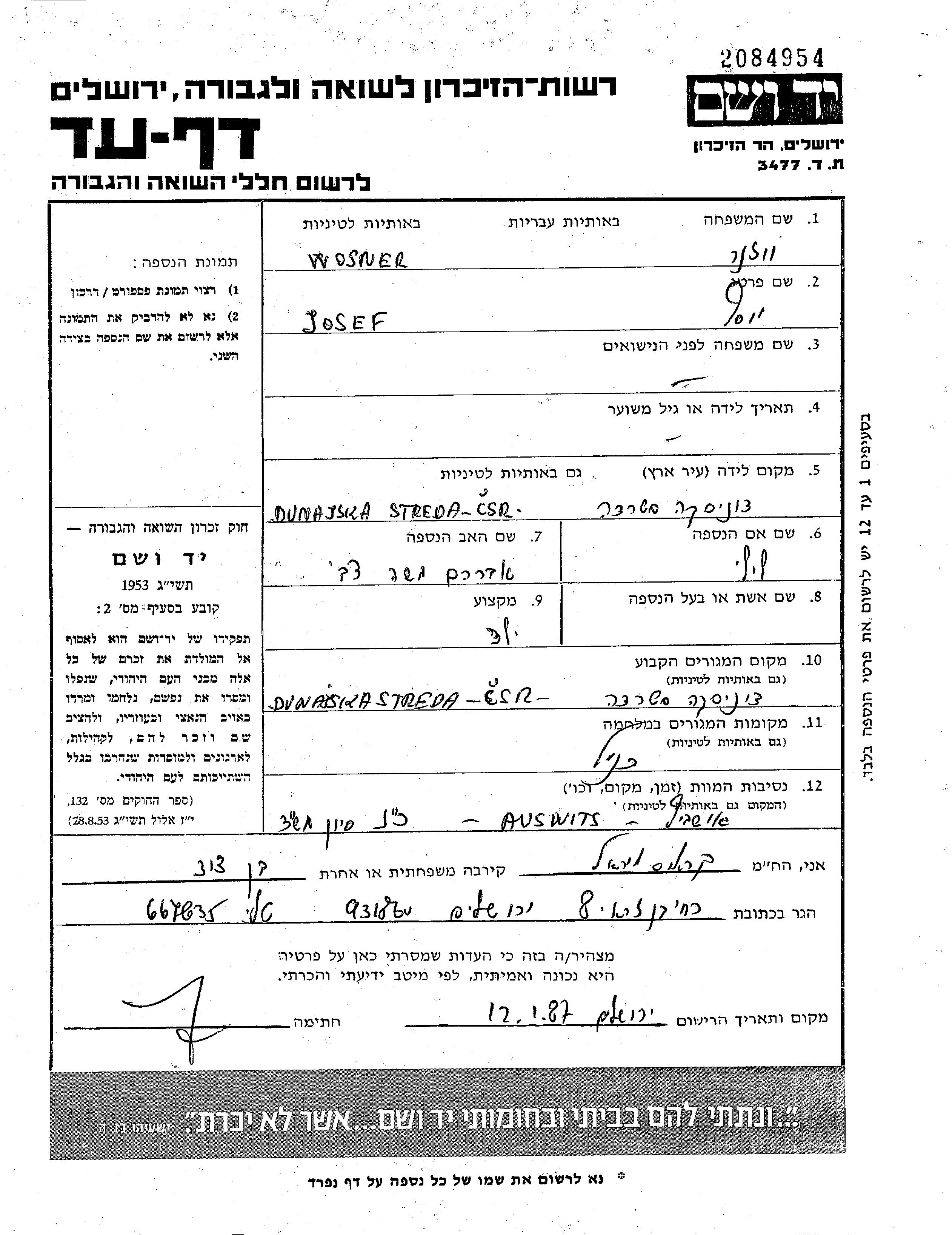 Josef Wosner Vozner wurde in Dunajska Streda, Tschechoslowakei geboren. Er war der Sohn von Avraham Arpad Moshe Tzvi und Lili. Er war Kind. Vor dem Zweiten Weltkrieg lebte er in Dunajska Streda, Tschechoslowakei. Während des Krieges war er in Dunajska Streda, Tschechoslowakei.