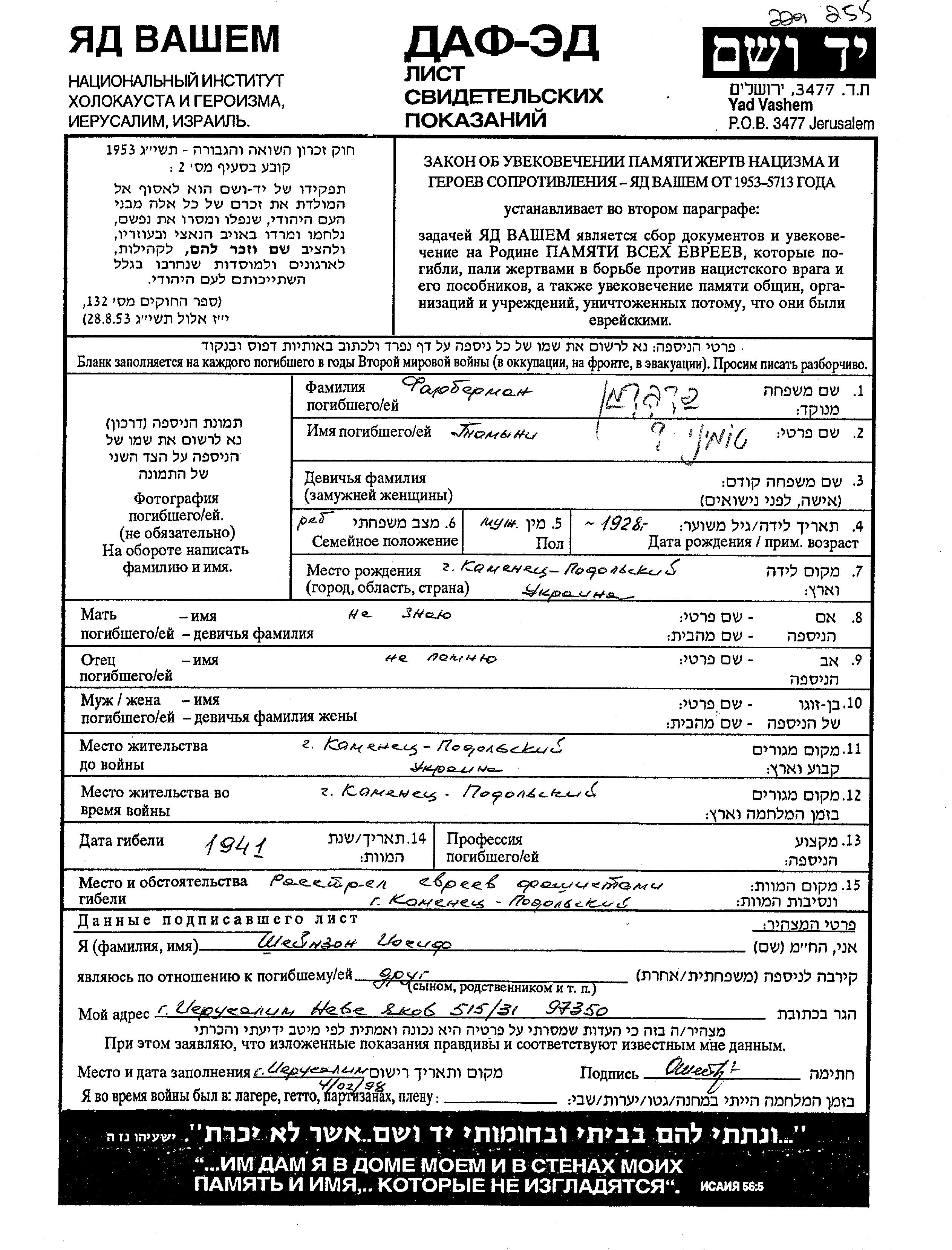 Tomyni Farberman wurde im Jahr 1928 in Kamenets Podolskiy, Ukraine (UdSSR) geboren. Er war Kind. Vor dem Zweiten Weltkrieg lebte er in Kamenets Podolskiy, Ukraine (UdSSR). Während des Krieges war er in Kamenets Podolskiy, Ukraine (UdSSR).
